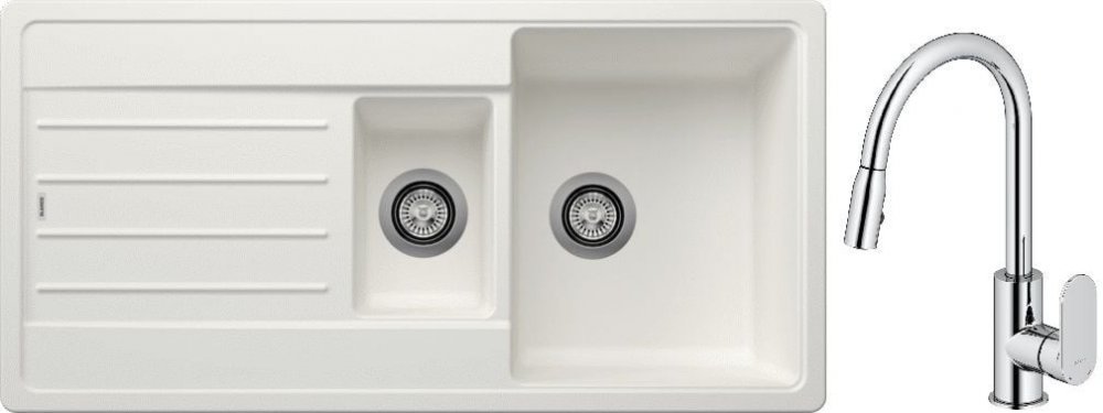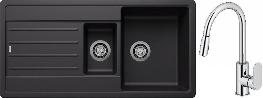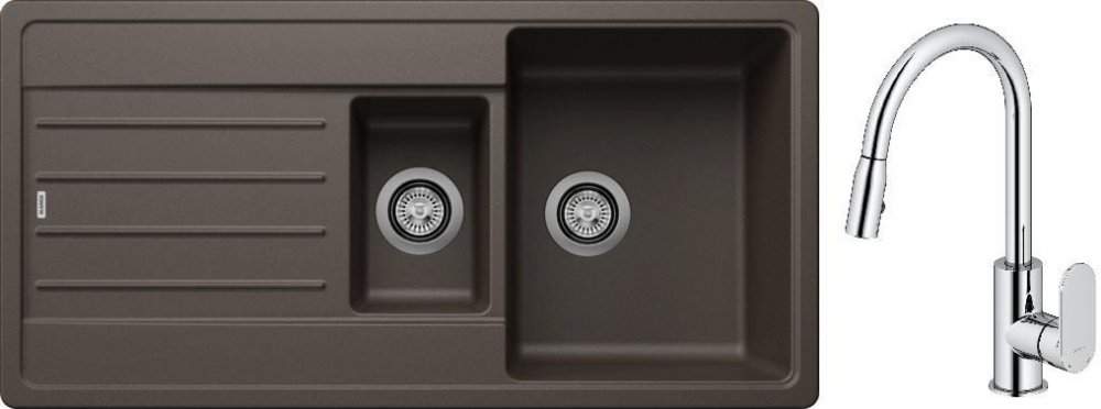 Blanco Legra 6 S dřez 100x50 cm s kávou Silgranit 522212 - vnější rozměry: 100 x 50 cm- rozměry velké mísy: 34,5 x 43 cm- hloubka velké mísy: 19 cm- rozměry malé komory: 17 x 26,5 cm- hloubka malé mísy: 12 cm- oboustranný dřez- vhodný pro šířku skříňky od 60 cm- 2 otvory pod výliskem- přepadové a odtokové kování je součástí dodávky- sifonový sifon je třeba dokoupit zvlášť- 2 zátky 3 1/2" se sítky- bez automatické zátky na vodu- dřez pro zapuštěnou montáž- odolný proti poškrábání, odolný vůči vysokým teplotám do 280 °C, praskání, potravinářským kyselinám, odolný vůči slunečnímu záření- materiál: Silgranit (hladký, homogenní povrch, který působí jako kámen) - materiál (Silgranit) je tvořen z 80 % přírodní žulou v kombinaci s keramikou, akrylem a barevnými pigmenty pro jedinečné vlastnosti a krásný vzhled- barva: káva - záruka: 2 roky Kuchyňská baterie Oltens Lista s vytahovacím výtokem chrom 35202100- jednopáková kuchyňská baterie- vybavena keramickou hlavicí pro přesný chod po celou dobu životnosti baterie- baterie je díky povrchové úpravě DoubleChrome odolná proti znečištění a zašmodrchání- její lesk vydrží dlouhá léta- kuchyňská baterie Oltens Lista byla navržena s ohledem na funkčnost a ergonomii- charakteristický tvar výsuvné výpusti s možností otáčení výtokové trubice o 360°. - práce v kuchyni je pohodlnější a komfortnější- mixér má výsuvnou hubici zakončenou dvouproudovým perlátorem s tlakovým spínačem- přepínání výtoku se provádí pomocí elegantního tlačítka- baterie je ideální pro dvojité dřezy; vytahovací výtok umožňuje používat obě komory dřezu- tvar a výška výpusti umožňuje naplnit vodou i velké hrnce- připojovací hadice G3/8, délka 450 mm, součást sady- baterie má systém snadné montáže- lze použít s průtokovými ohřívači vody- materiál mosaz- barva chrom