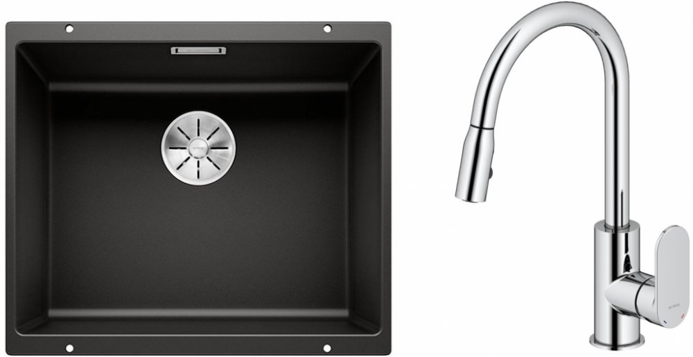 1. Dřez Blanco Subline 500-U (525995) - rozměry dřezu: rozměry: 53 x 46 cm - rozměry mísy: 50 x 40 cm - hloubka mísy: 19 cm - hodí se ke skříňce o šířce 60 cm a větší - bez otvoru pro baterii - přepad a odtokové armatury jsou součástí dodávky - sifonový sifon je třeba dokoupit zvlášť - inFino® 3 1/2" zátka se sítkem - montážní sada (těsnění je třeba zakoupit zvlášť) - s C-přepadem - odolný proti poškrábání, žáruvzdorný do 280 °C, odolný proti praskání, odolný proti potravinářským kyselinám, odolný proti slunečnímu záření - podomítkový dřez - materiál: Silgranit PuraDur (hladký, homogenní povrch připomínající kámen) - materiál (Silgranit) se skládá z 80 % z přírodní žuly v kombinaci s keramikou, akrylátem a barevnými pigmenty pro jedinečné vlastnosti a krásný vzhled - barva: černá 2. Kuchyňská baterie Oltens Lista (35202100) - jednopáková kuchyňská baterie - vybavená keramickou kartuší pro přesný chod po celou dobu životnosti baterie - baterie je díky povrchové úpravě DoubleChrome odolná proti znečištění a zašmodrchání - její lesk vydrží dlouhá léta - kuchyňská baterie Lista od společnosti Oltens byla navržena s ohledem na funkčnost a ergonomii - charakteristický tvar vytahovací výpusti s možností otáčení výtoku o 360°. - práce v kuchyni je pohodlnější a komfortnější - mixér má výsuvnou výpusť zakončenou dvouproudovým perlátorem s tlakovým spínačem - přepínání výtoku se provádí pomocí elegantního tlačítka - baterie je ideální pro dvojité dřezy; vytahovací výtok umožňuje ovládat obě komory dřezu - tvar a výška výpusti umožňují naplnit vodou i velké hrnce - komplet s připojovacími hadicemi G3/8 o délce 450 mm - baterie má systém snadné montáže - lze použít s průtokovými ohřívači vody - materiál mosaz- barva chrom