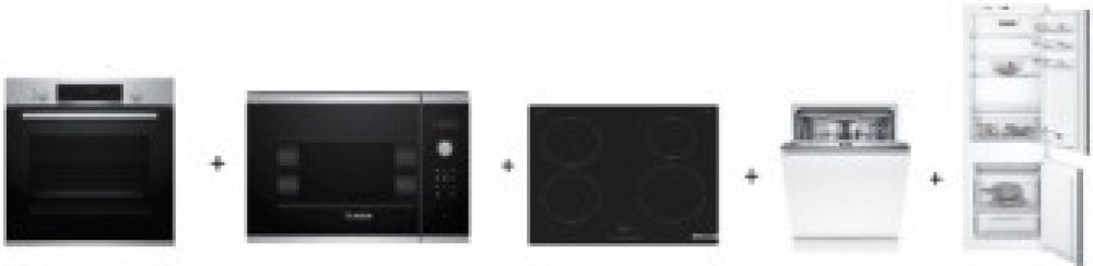 Set vestavných spotřebičů Bosch - horkovzdušná trouba + mikrovlnná trouba + indukční varná deska + vestavná myčka nádobí + vestavná chladnička s mrazákem