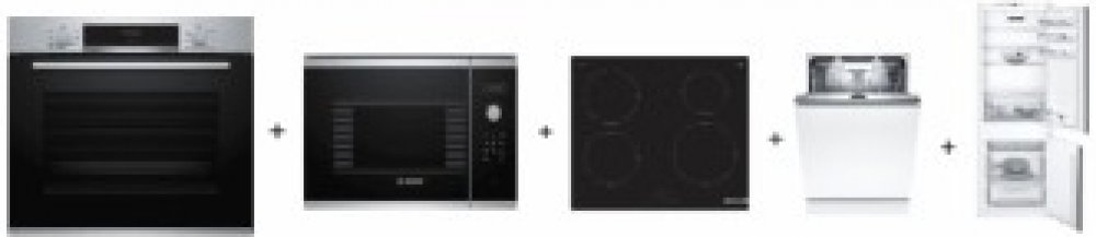 Set vestavných spotřebičů Bosch - horkovzdušná trouba + mikrovlnná trouba + indukční varná deska + vestavná myčka nádobí + vestavná chladnička