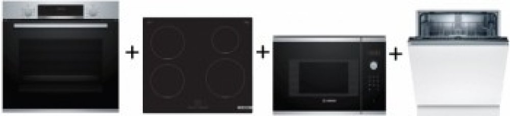 Set vestavných spotřebičů Bosch - horkovzdušná trouba + indukční varná deska + mikrovlnná trouba + vestavná myčka nádobí