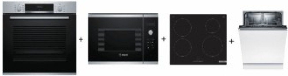 Set vestavných spotřebičů Bosch - horkovzdušná toruba + mikrovlnná toruba + indukční varná deska + plně integrovaná myčka