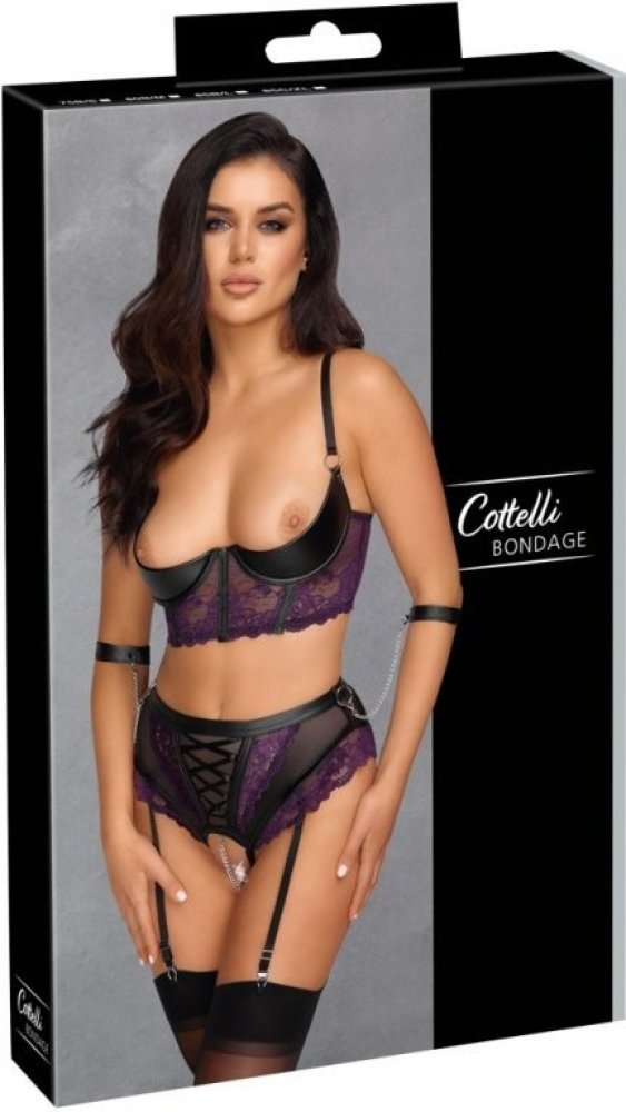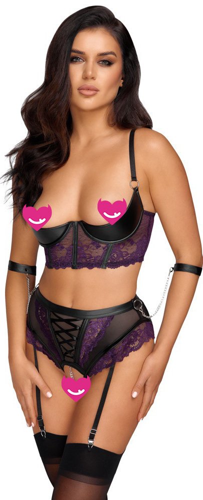 Chcete se stát královnou večera? Oblečte si toto prádlo a věřte, že vám nepůjde odolat! Sadu tvoří polo-otevřená podprsenka, otevřené podvazkové kalhotky a pouta na zápěstí. Jemná fialová květinová krajka v kombinaci s černým materiálem matného vzhledu vytváří půvabný erotický dojem, díky němuž se budete cítit sexy jako nikdy před tím!