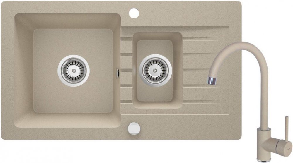 Granitový 1 komorový dřez Zorba je produkt, který se bude skvěle vyjímat v minimalistických nebo skandinávských aranžmá kuchyní. Součástí sady je také působivá dřezová stojánková baterie se zvýšeným tělem a výtokem ve tvaru U ve stejné barvě. Dřez je vyroben z granitu a má všechny výhody tohoto extrémně tvrdého a otěruvzdorného materiálu. Patří mezi ně odolnost proti změně barvy, poškrábání, tepel...
