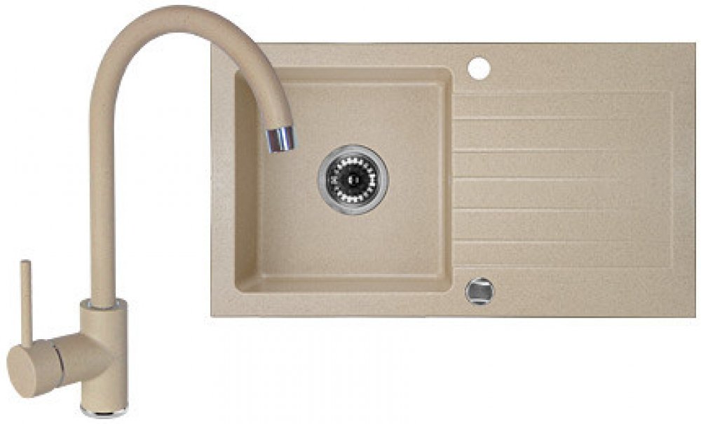- dřez s 1 mísou a odkapávačem- extrémně odolný proti teplu, nárazům a poškrábání- rozměry: délka 76 cm, šířka 44 cm, hloubka mísy 15 cm- vestavná instalace, oboustranná, pro velikost skříňky: 45 cm- odtok 3,5 palce- možnost připojení myčky nádobí- 2 předvrtané otvory pro baterie- přepad ve dřezu- sifon kompletní- jednopáková baterie- s výpustí ve tvaru U-výška těla: 35,5 cm- keramická hlavice: 35 mm- s provzdušňováním vodním paprskem- dřezová a vodovodní baterie v pískové barvě