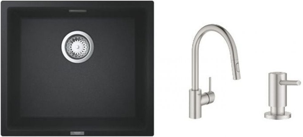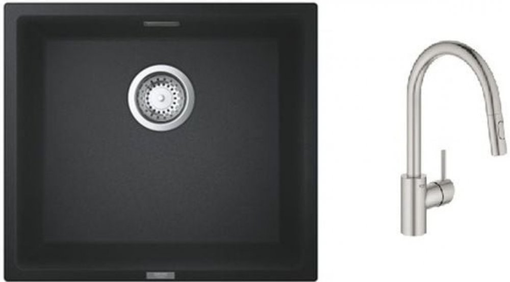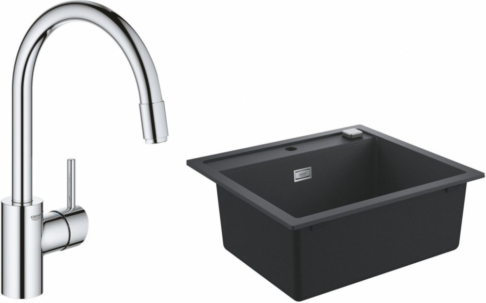1. Dřez 56 x 51 cm Grohe K700 31651AP0- model: K700 60-C 56/51 1.0- rozměry dřezu: 56 x 51 cm- rozměry mísy: 50 x 36 cm- hloubka mísy: 20 cm- minimální délka skříňky: 60 cm- s 1 otvorem pro baterii- automatický přepad- s rychlomontážním systémem Grohe FastFixation- dřez k montáži pod omítku- výřez: 54,5 x 49,5 cm- sada obsahuje: automatickou odtokovou soupravu se sifonem, odtokové sítko, instalační sadu- počet montážních držáků v balení: 8- materiál: křemenný kompozit- barva: černá žula2. Kuchyňská baterie Grohe Concetto 31483DC2- vysoká výtoková trubice- jednootvorová instalace- Grohe SilkMove keramická kartuše 35 mm- Grohe EasyDock snadno vytahovací výsuvná sprcha- Grohe Zero oddělené vodní kanály, žádný kontakt vody s olovem a niklem- s výsuvným postřikovačem a dvěma režimy postřiku- přepínání: perlátor/sprcha SpeedClean- nastavitelný omezovač průtoku- otočná výtoková trubice- úhel otáčení 360°- ochrana proti zpětnému toku- flexibilní připojovací hadice- Grohe FastFixation se systémem rychlé montáže- povrchová úprava: nerezová ocel