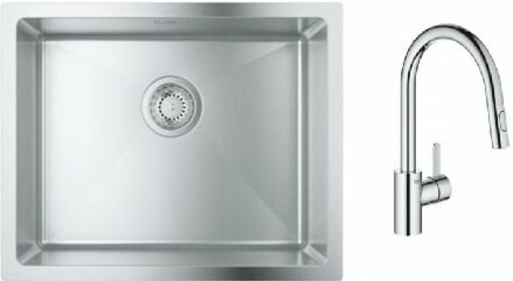 Grohe K700 nerezový dřez 55x45 cm satén 31574SD1- model: K700U 60-S 54,4/44,4 1,0- vnější rozměry: 55 x 45 cm- rozměry mísy: 50 x 40 cm- hloubka mísy: 20 cm- Grohe Whisper- typ instalace: vestavná, pod omítku nebo pod skříňku - výřez (montáž na desku): 535 x 435 mm - výřez (zápustná montáž): (R3) (rozměry 551 x 451 - hloubka R8 -3,5 mm) - minimální délka skříně: 60 cm- se systémem rychlé montáže G...