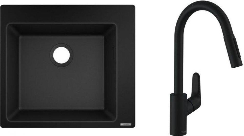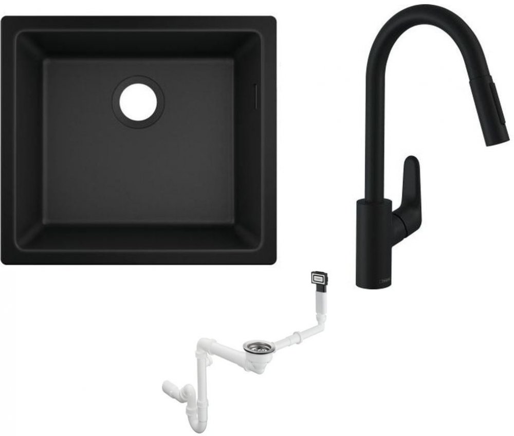 1. Granitový dřez Hansgrohe S510-U450 50x45 cm černý grafit 43431170 - pro montáž pod omítku- počet mís: 1 hlavní mísa- hloubka dřezu: hloubka dna: 190 mm- rozměry výřezu: vnitřní rozměr: 448 x 398 mm- velikost skříňky: 60 cm- umístění přepadu: na pravé straně hlavní mísy- součástí dodávky: montážní svorky- materiál: SilicaTec (80 % kameniva a 20 % akrylové pryskyřice)- barva: grafitově černá 2. Hansgrohe Focus M41 stojánková kuchyňská baterie černá matná 31815670- s výsuvným výtokem a přepínačem- ComfortZone 240- otočná výtoková trubice 150°- laminární výtok a sprchová tryska- sprchová sprcha s tlačítkovým přepínáním proudu- magnetická rukojeť- s rychloupínací sponou na hadici- průtok při 3 barech: 9,5 l/min- keramická směšovací baterie- připojovací hadice G ⅜"- zpětný ventil- lze kombinovat s průtokovými ohřívači vody- QuickClean - snadné odstranění vodního kamene: silikonové nopky na perlátoru baterie a na sprchových tryskách- barva: matná černá3. Dřezová sifonová baterie Hansgrohe chrom 43927000 - pro jednu granitovou mísu - skládá se z: odtokové a přepadové sestavy, sítkového ventilu, sifonu- odpadní systém: ovládání odtoku se sítkem- průměr 40 / 50- 1 1/2'' s odtokovou trubkou a sifonem- sítkový ventil 3 1/2"