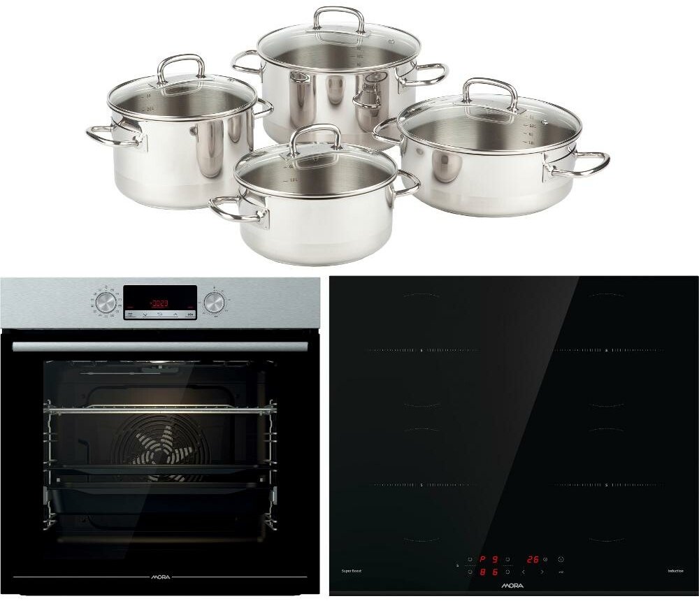 Indukční sklokeramická deska, 4 varné zony + Vestavná trouba, objem 77 l + Sada nádobí 8 kusů