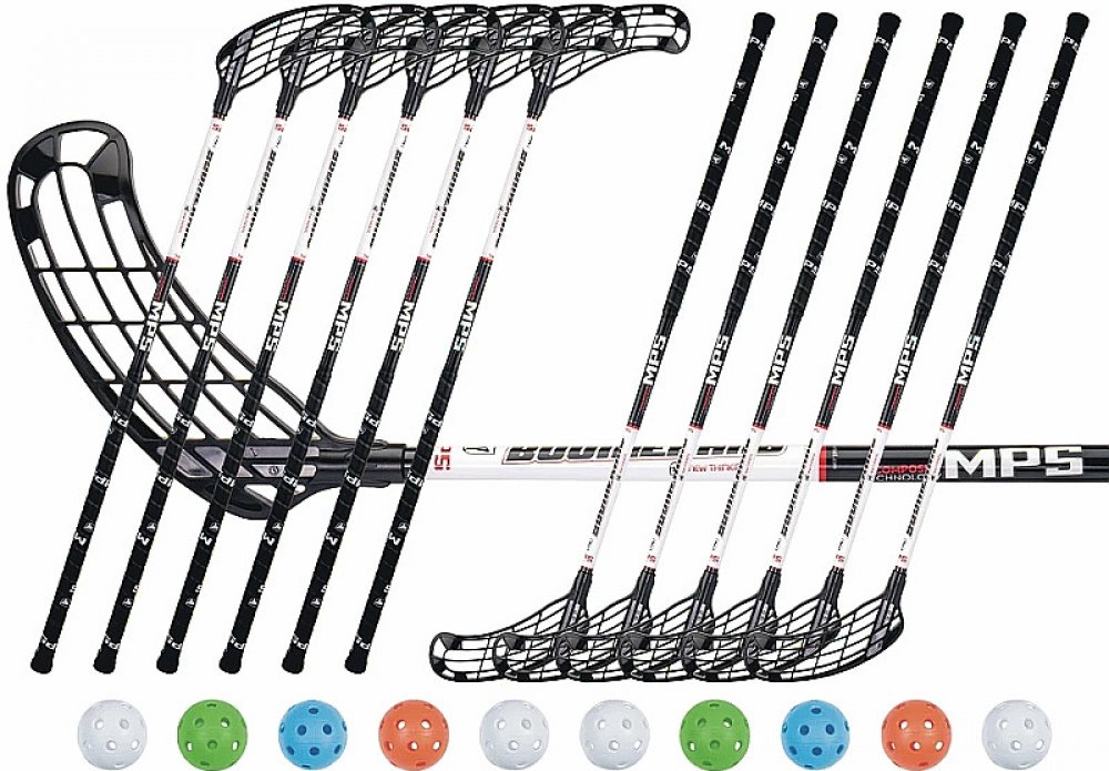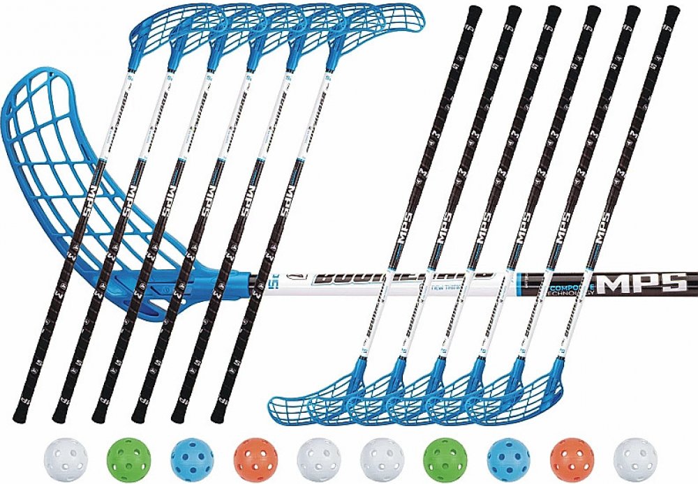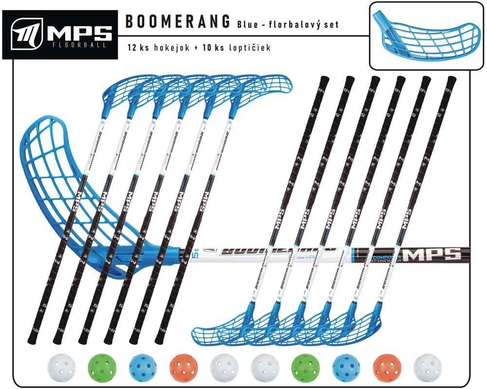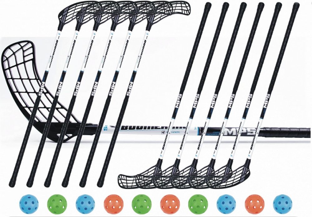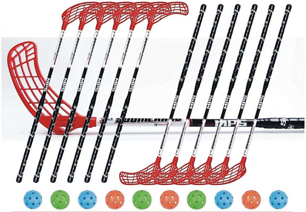Set florbalových hokejek MPS Boomerang, obsahující 12 hokejek a 10 míčků. Hokejky jsou vyrobeny ze sklolaminátu v tvrdosti 30 mm.
