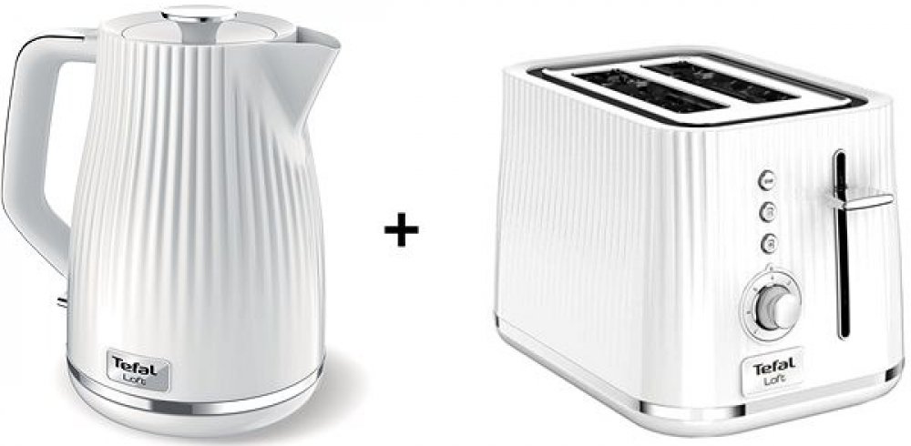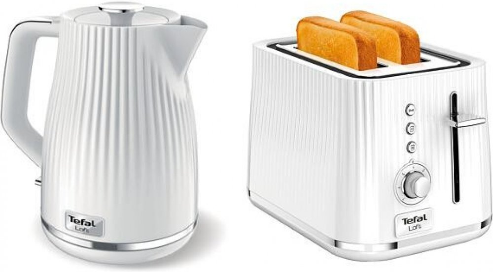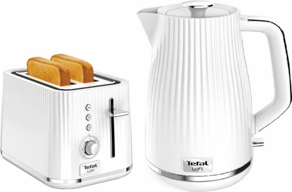 Tefal KO250130 Loft bílá rychlovarná konvice + topinkovač, konvice: objem 1,7 l, příkon 2400 W, materiál plast, ukazatel vodní hladiny, kontrolka provozu, skrytá spirála, filtr, otočná základna, automatické vypnutí a úložný prostor pro kabel, typ filtru vyjímatelný, bílá, topinkovač: příkon 800 W, počet topinek 2, extra široké otvory, regulace opékání, počet stupňů opékání 7, funkce opětovného ohřevu, rozmrazování, tlačítko okamžitého ukončení, vysoký zdvih, vyjímatelná miska na drobky, barva bílá