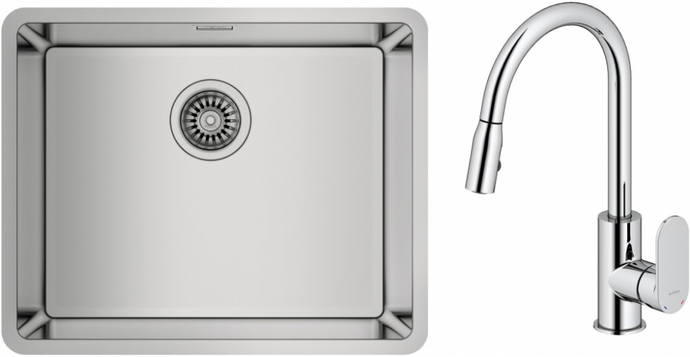 1. Dřez Teka Be Linea (115000005) - typ armatury: podomítková - pro skříňky od 60 cm - bez otvoru pro baterii - průměr odtoku: 3½" - 3½" odtok s přepadem - sifon s připojením na myčku nádobí v ceně - přepad: obdélníkový - tloušťka komory/trubky 1 mm - vnější rozměry 540 x 440 mm - rozměry hlavní komory 500 x 400 x 200 mm - odpadní souprava: ruční uzavírání - materiál: nerezová ocel - Systém SilentSmart - upevňovací prvky a sifonový sifon jsou součástí dodávky - povrchová úprava oceli: leštěná 2. Kuchyňská baterie Oltens Lista (35202100) - jednopáková kuchyňská baterie - vybavená keramickou kartuší pro přesný provoz po celou dobu životnosti - baterie je díky povrchové úpravě DoubleChrome odolná proti znečištění a zašlé barvě - její lesk vydrží dlouhá léta - kuchyňská baterie Lista od společnosti Oltens byla navržena s ohledem na funkčnost a ergonomii - charakteristický tvar vytahovací výpusti s možností otáčení výtoku o 360°. - práce v kuchyni je pohodlnější a komfortnější - baterie má výsuvnou výpusť zakončenou dvouproudovým perlátorem s tlakovým spínačem - přepínání výtoku se provádí pomocí elegantního tlačítka - baterie je ideální pro dvojité dřezy; vytahovací výtok umožňuje ovládat obě komory dřezu - tvar a výška výpusti umožňují naplnit vodou i velké hrnce - komplet s připojovacími hadicemi G3/8 o délce 450 mm - baterie má systém snadné montáže - lze použít s průtokovými ohřívači vody - materiál mosaz - barva chrom