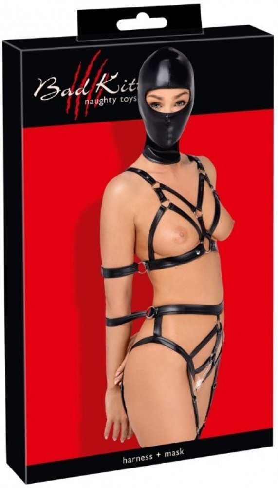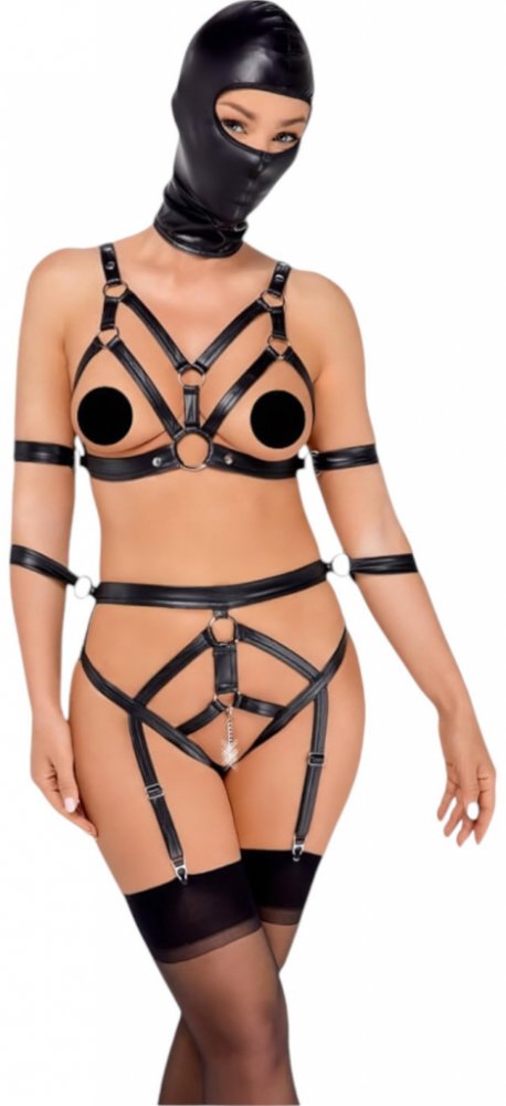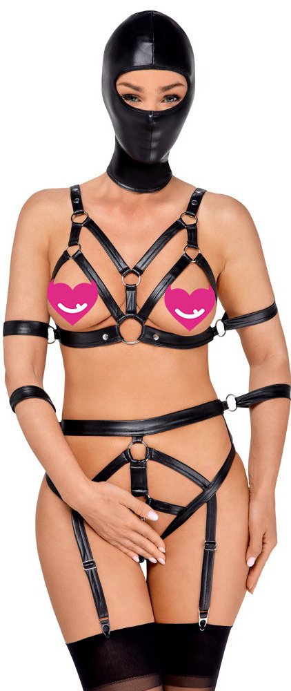 Extrémní harnes set s extra doplňkem pro pořádně divoké BDSM párty! Proč je to super? Pevné, širší černé popruhyPopruhy jsou nastavitelné, takže sadne přesně na tvoje tělo - na ramenou s knoflíkyPopruhy nechávají intimní partie a prsa volně odkryté, takže je vidět úplně vše a outfit můžeš mít na sobě i při akciMezi pysky se zasouvá jemný řetízek, který ještě více rozproudí napětí, ale klidně ho můžeš odepnoutDva pásky na suchý zip na zápěstí - jemně omezí pohybPopruhy zakončené podvazky - kombinuj s oblíbenými punčochami (délka nastavitelná)Součástí je i maska na hlavu - kromě spodního a vrchního dílu dostaneš i masku pouze s očními otvoryNa to bacha: Per ručně v jemném pracím prostředku, nesuš v sušičce a nežehliSpecifikace produktu: nastavitelné popruhy s knoflíkyotevřený rozkrok s řetízkemotevřená podprsenka2 páry pout na řetízkuneodnímatelné podvazkymaska na hlavu s otvory pouze na očibarva: černámateriál: 95% polyester, 5% spandexDostupné velikosti: XS, S, M, L, XL Doporučená údržba: Per pouze ručně v jemném pracím prostředku, neběl, nesuš v sušičce a nežehli.