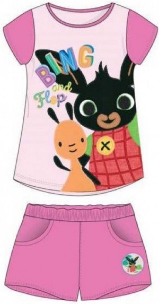 Krásný a pohodlný dívčí plážový komplet / set (tričko a kraťasy) vyrobený ze 100% bavlny s motivem zajíček Bing. Tričko má krátký rukáv, přední stranu zdobí obrázek zajíčka Binga a kamaráda Flopa. Šortky mají v pase gumu a dvě kapsy.