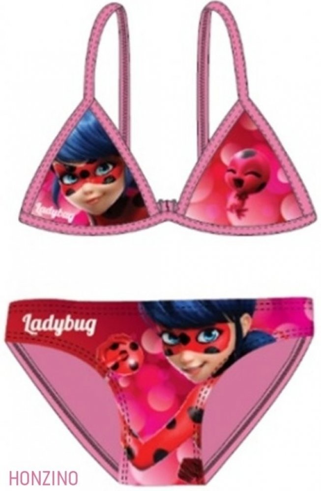 Krásné růžové dětské dvoudílné plavky s motivem LADYBUG Miraculous. Horní i spodní díl zdobí obrázek Kouzelné berušky. Horní díl má zapínaní na zadní straně plastovou sponou.