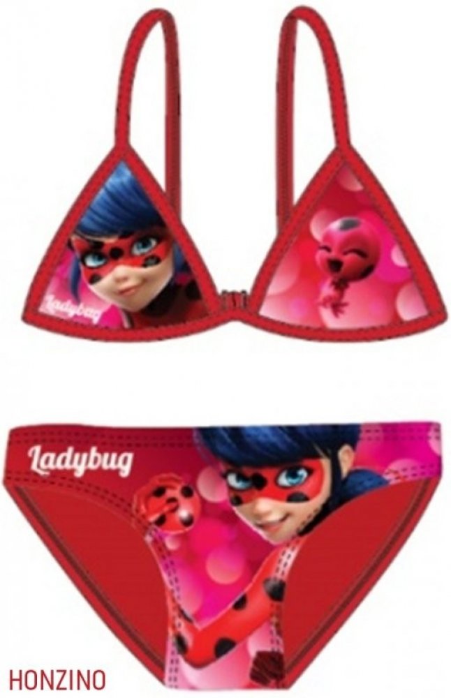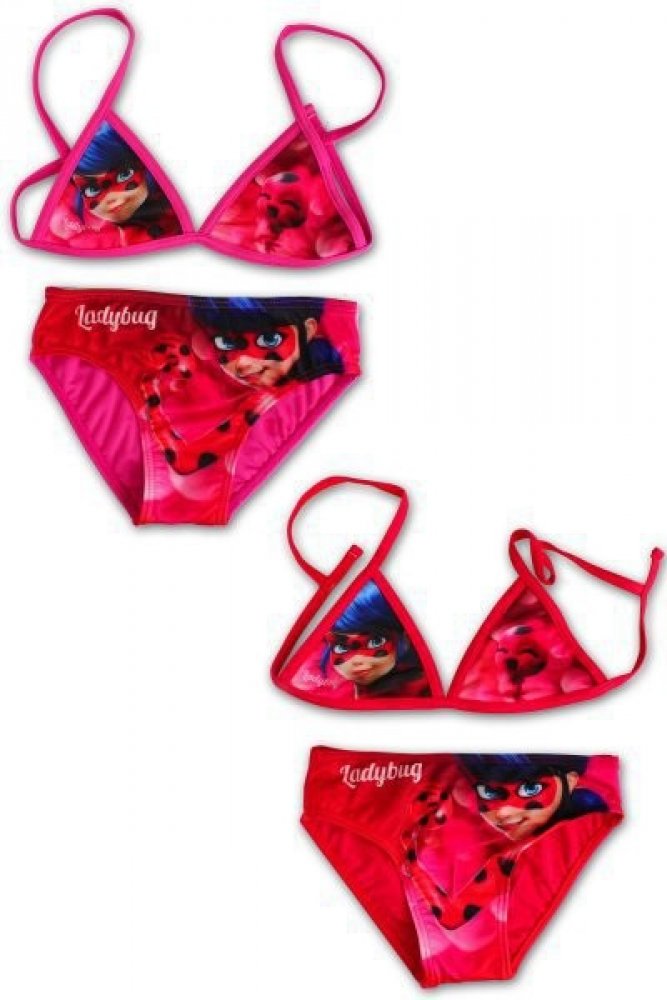 Krásné červené dětské dvoudílné plavky s motivem LADYBUG Miraculous. Horní i spodní díl zdobí obrázek Kouzelné berušky. Horní díl má zapínaní na zadní straně plastovou sponou.