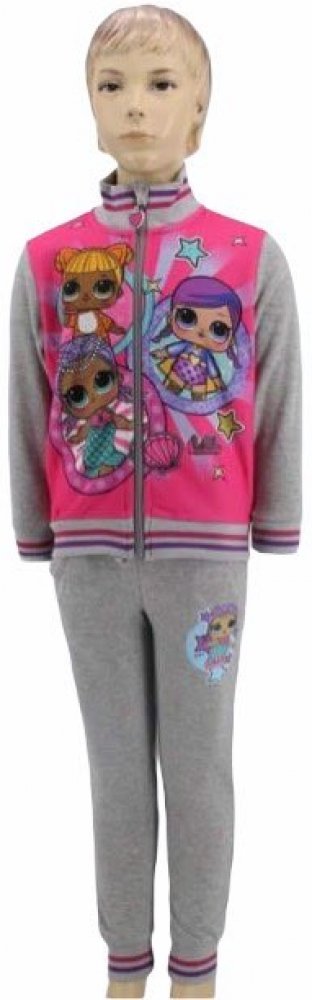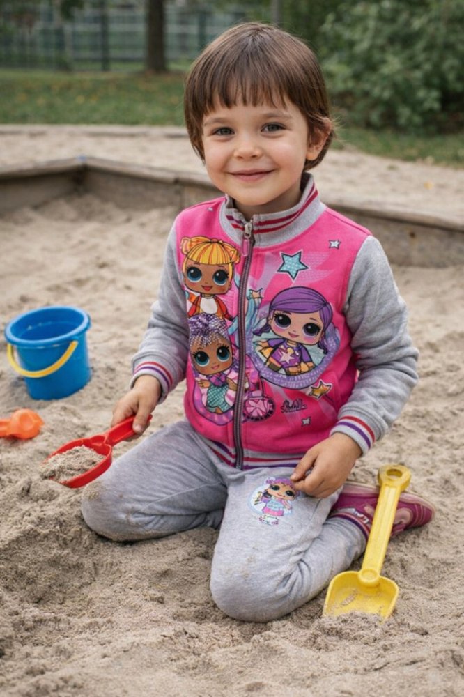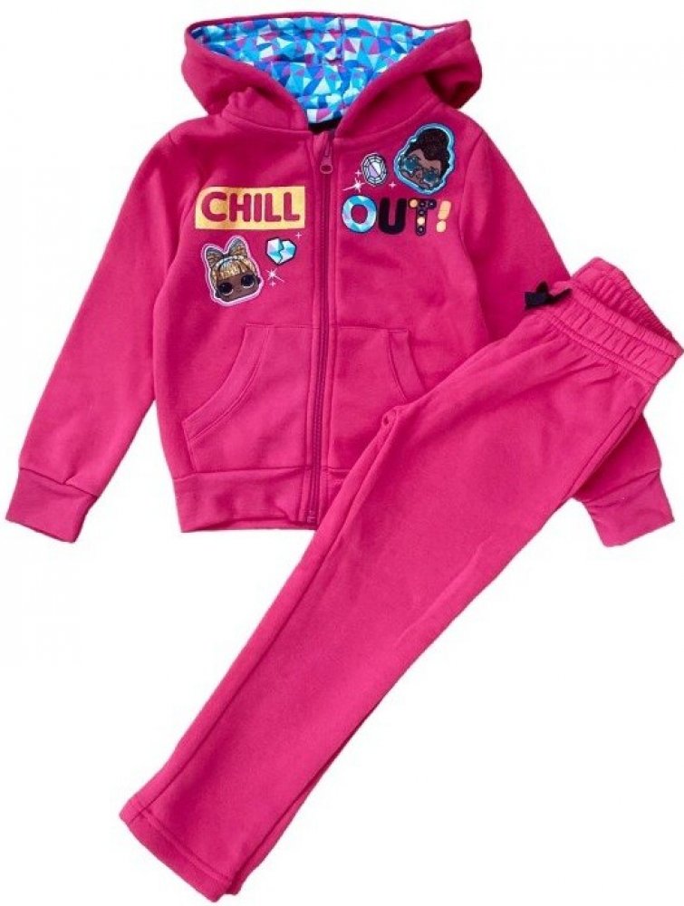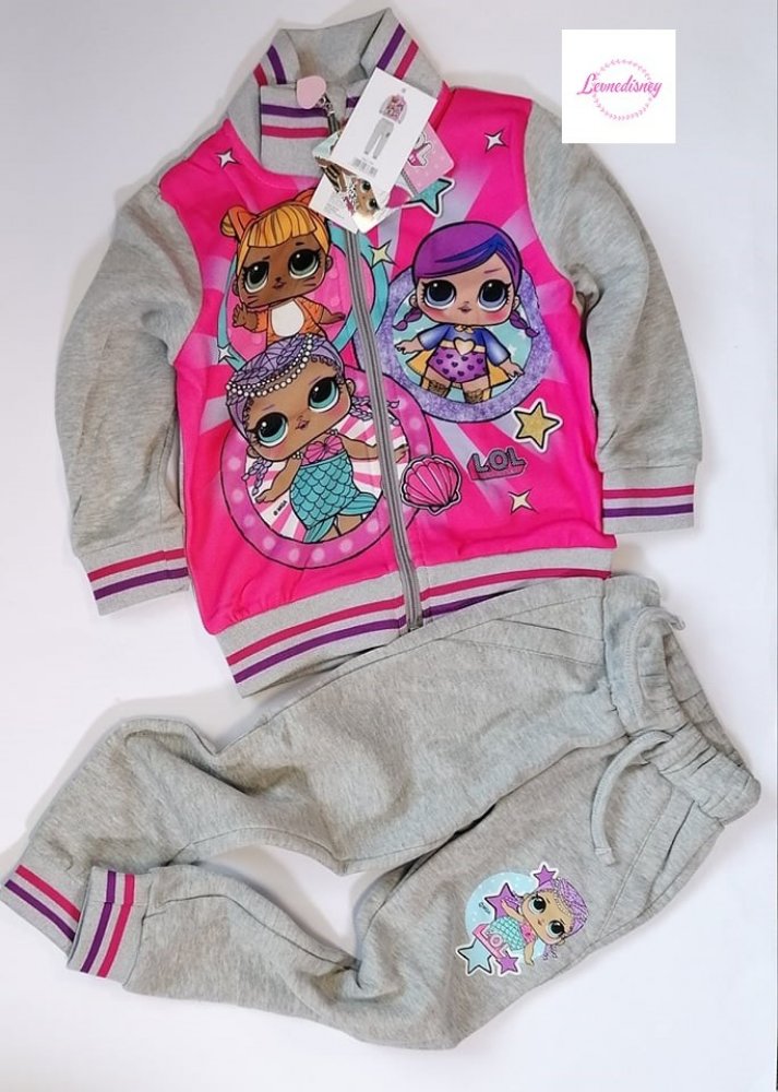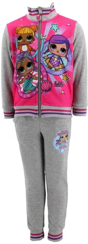 Krásná tepláková souprava s oblíbeným motivem panenek LOL Surprise, uvnitř hřejivý chloupek. Mikinka má zapínání na zip, jsou na ni vyobrazeny 3 panenky LOL, motiv je látkový, na jezdci zipu 3D ozdoba, s praktickým stojáčkem u krku. Tepláčky mají boční kapsičky, šňůrka v pase je funkční, jsou ukončeny do praktických manžet.