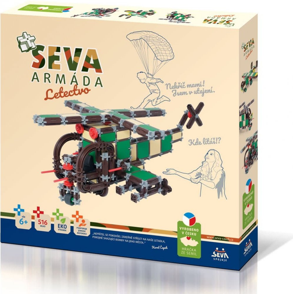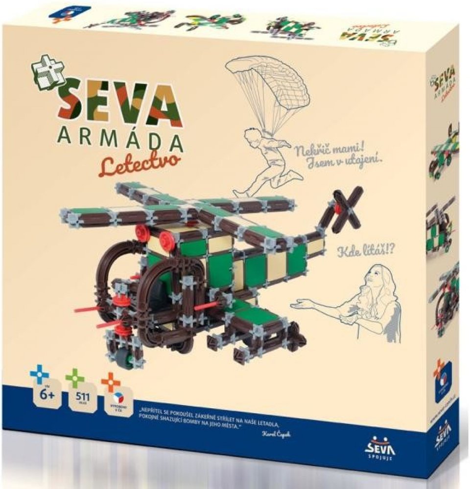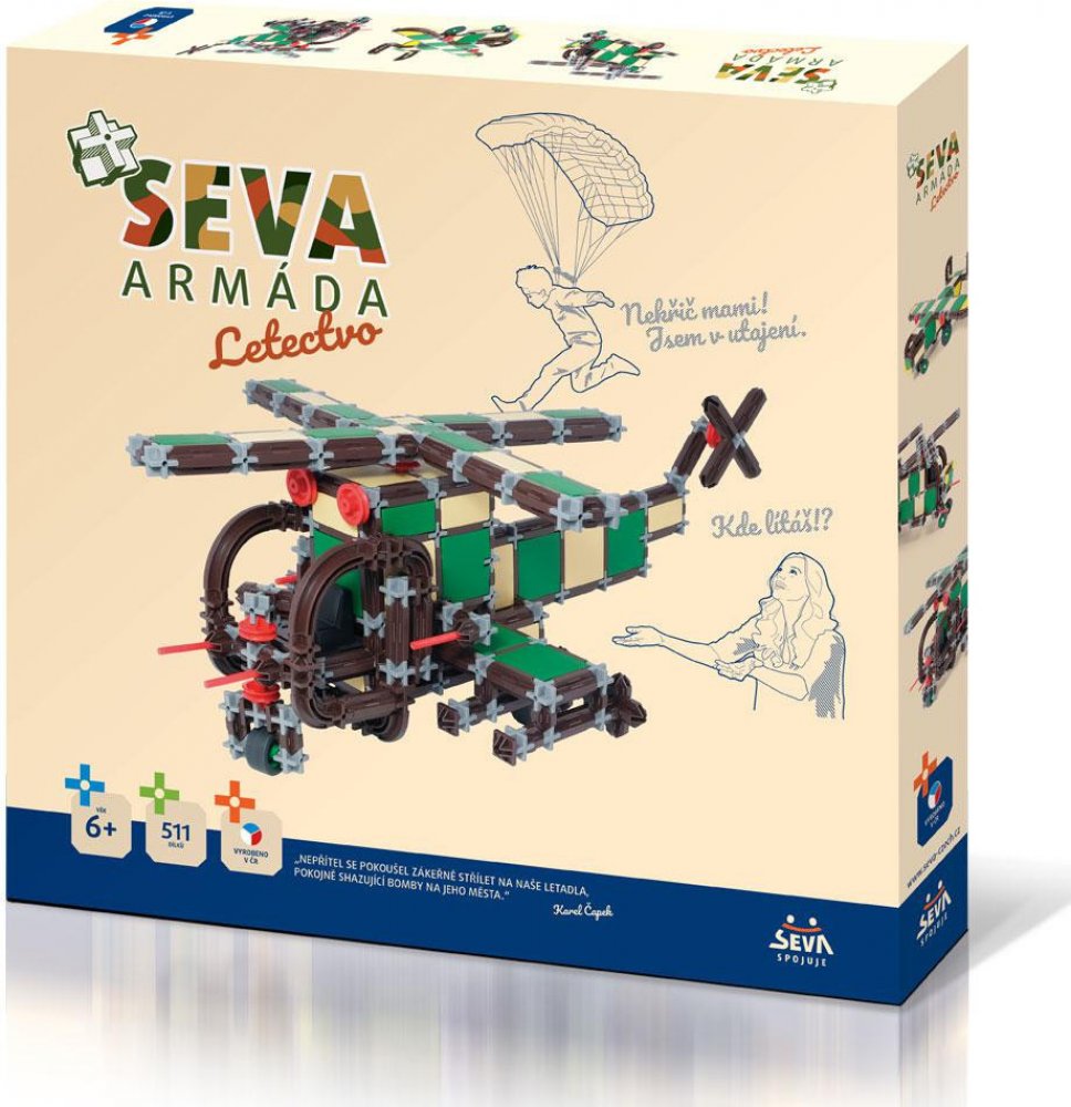 Technické údaje:Obsah balení:Stavebnice Seva Armáda letectvo plast 511 dílků v krabici 35x33x5cmPokud není uvedeno jinak, cena se vztahuje na 1 ks produktu.Konkrétní barvu nebo druh výrobku není možné z technických důvodů zvolit, objednávce bude přidělena náhodná varianta dle skladových možností.