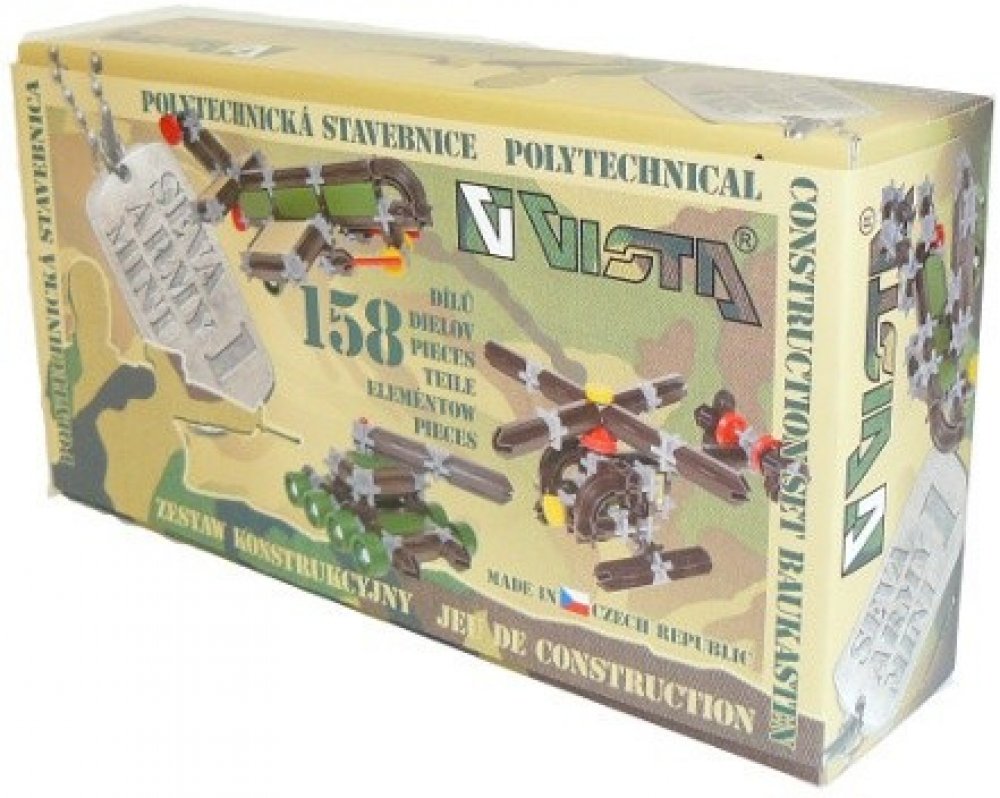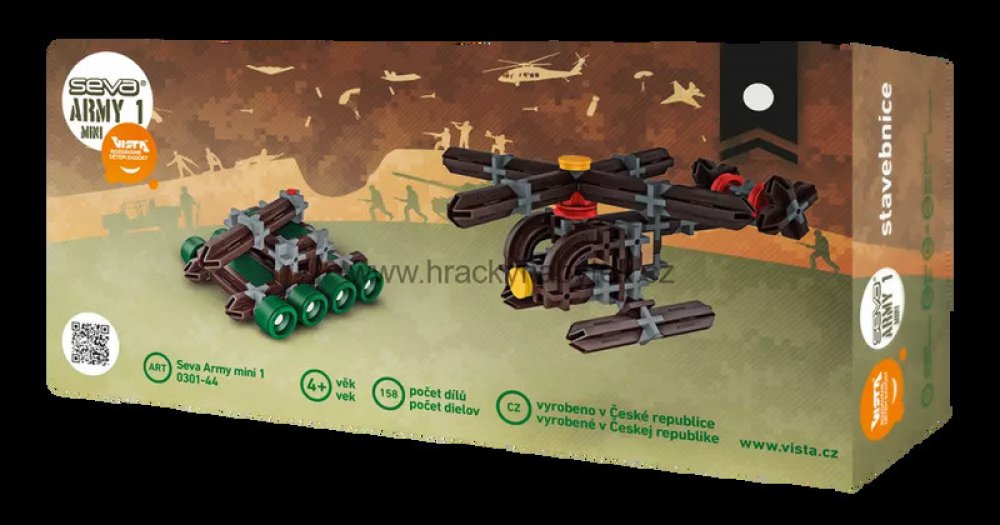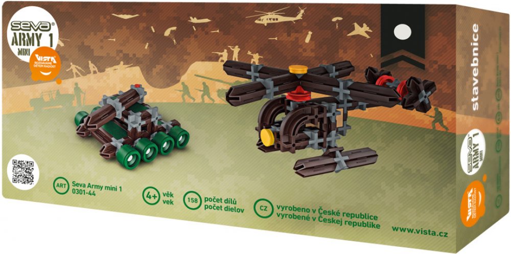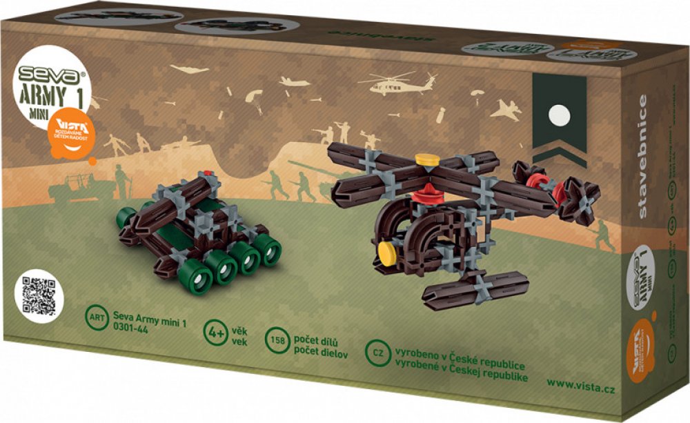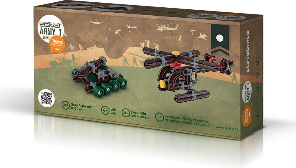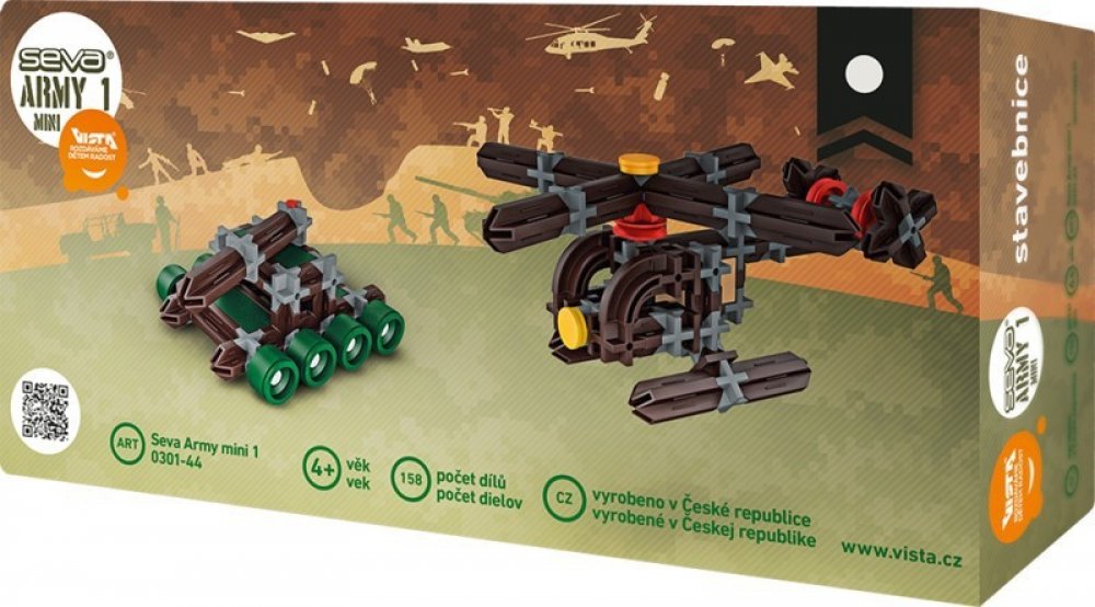 Stavebnice SEVA Army mini - 158 dílků. Balení obsahuje dílky k sestavení vojenské techniky jako jsou tanky, letadla a vrtulníky. Jednotlivé dílky stavebnice jsou vyrobeny ve vojenských barvách. Stavebnice SEVA Army mini - 158 dílků. Balení obsahuje dílky k sestavení vojenské techniky jako jsou tanky, letadla a vrtulníky. Jednotlivé dílky stavebnice jsou vyrobeny ve vojenských barvách.