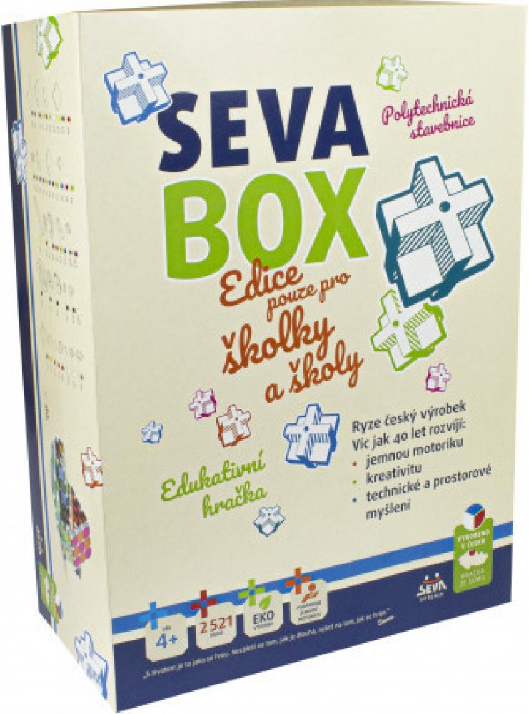 Tento velkokapacitní Seva BOX o objemu 34 litrů je určen pro školky, školní družiny, dětské kluby a další zařízení, kde si hraje více dětí ve věku přibližně od 4 do 10 let. Jde o kreativní stavebnici, stavět lze podle návodu i bez návodu. Díky univerzálnosti dílů lze postavit s fantazií prakticky cokoliv. Seva BOX obsahuje směs dílů z ostatních řad Obsahuje směs kostiček ze známých řad stavebnic Seva, takže tu najdete dílky z