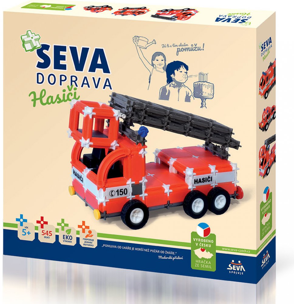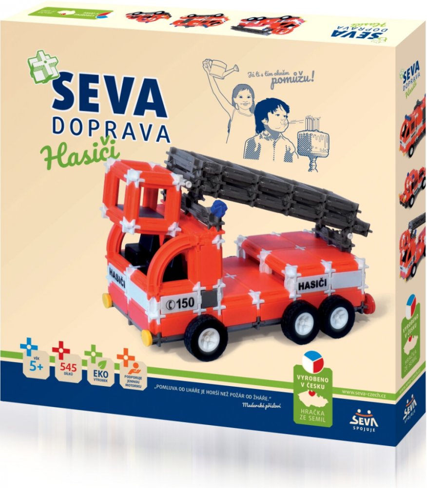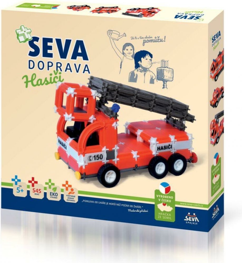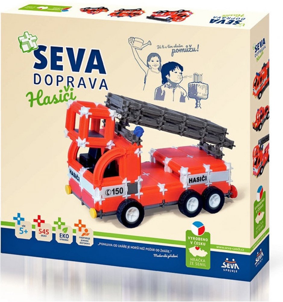 Stavebnice SEVA obsahuje celkem 545 dílků. Malé děti se naučí jednotlivé dílky spojovat. Starší potomci sestaví hasičský vůz, auto s velkou cisternou nebo vytvoří jiné věci podle návodu či podle své fantazie. Z jednotlivých dílků se dá postavit skoro vše. Vaše ratolest si během hraní rozvíjí kreativitu, manuální zručnost a trénuje mysl.