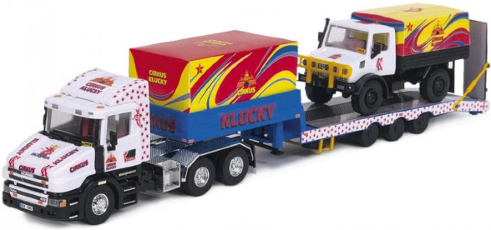 Seva Monti System 1396 CIRKUS KLUCKY Scania přepravník s Unimogem 1:48
