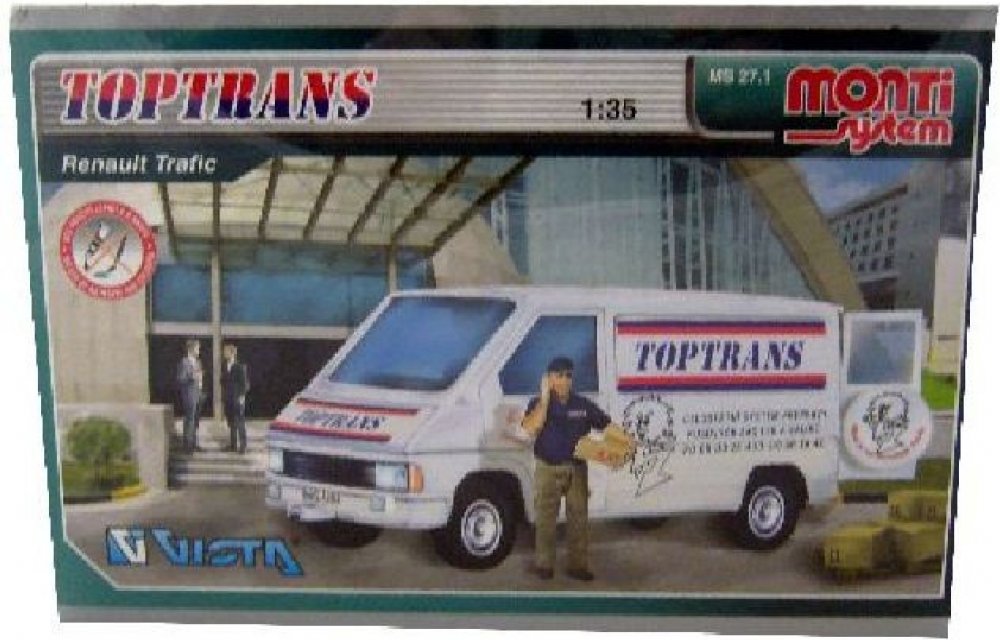 STAVEBNICE MONTI 27.1 TOPTRANS TRAFIC je přepravní dodávka od Toptransu. Jeho Model se vyznačuje velikostí v měřítku 1:35. Patří do řady modelů Monti System BASIC mezi jednodušší stavebnice s menším počtem dílů.