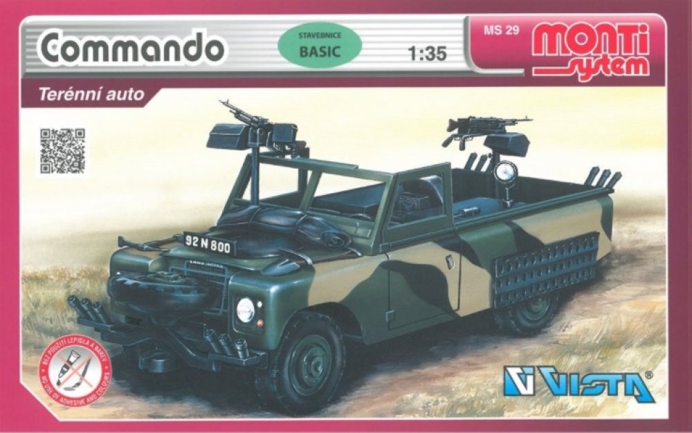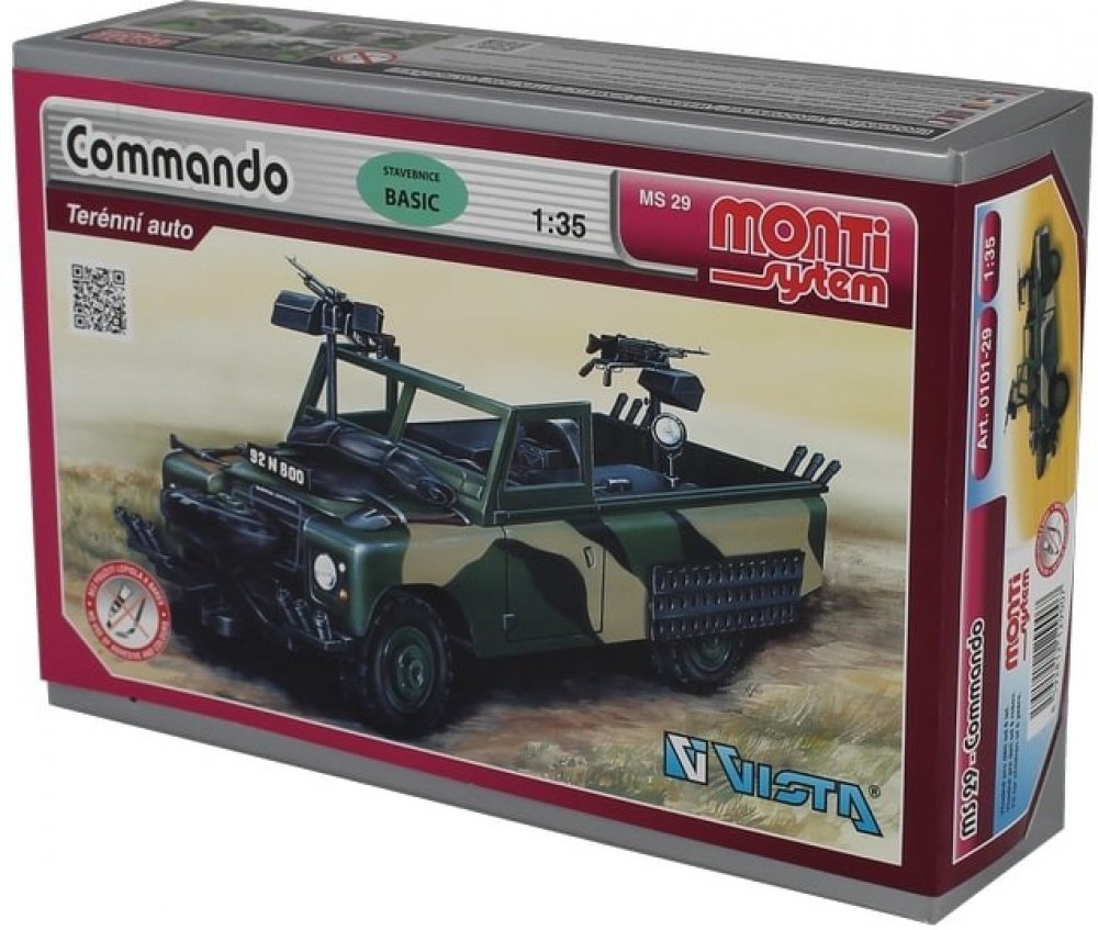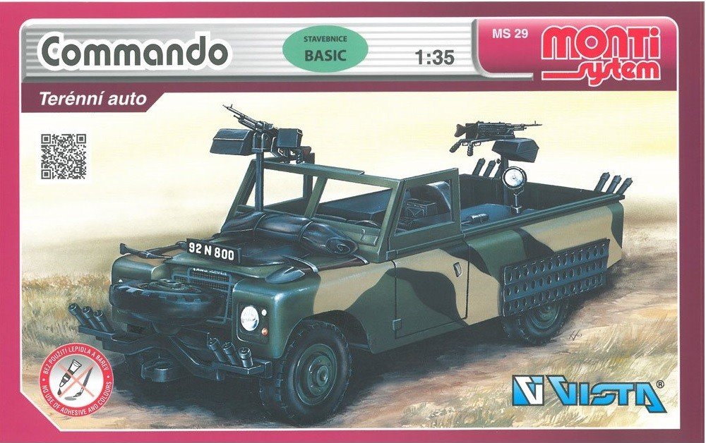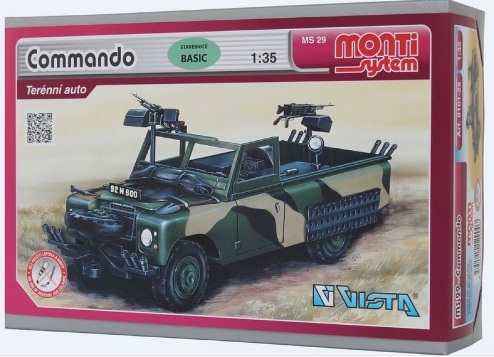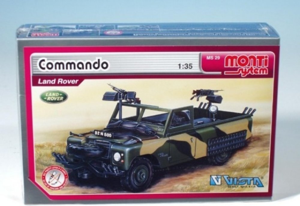 Model Monti System MS č.29 - Commando je ozbrojený terénní Land Rover. Land Rover Monti System MS 29 v měřítku 1:35 patří do řady modelů Monti System BASIC, tedy mezi jednodušší stavebnice s menším počtem dílů.