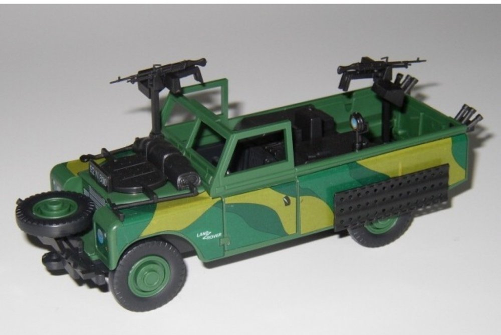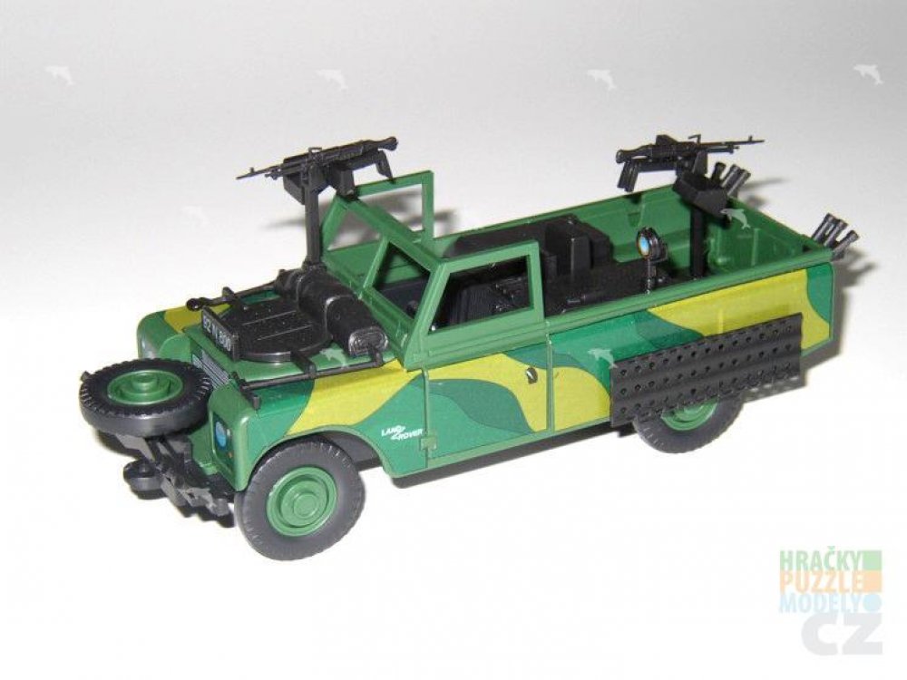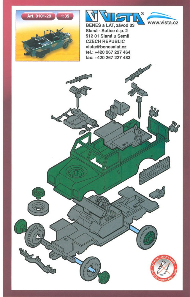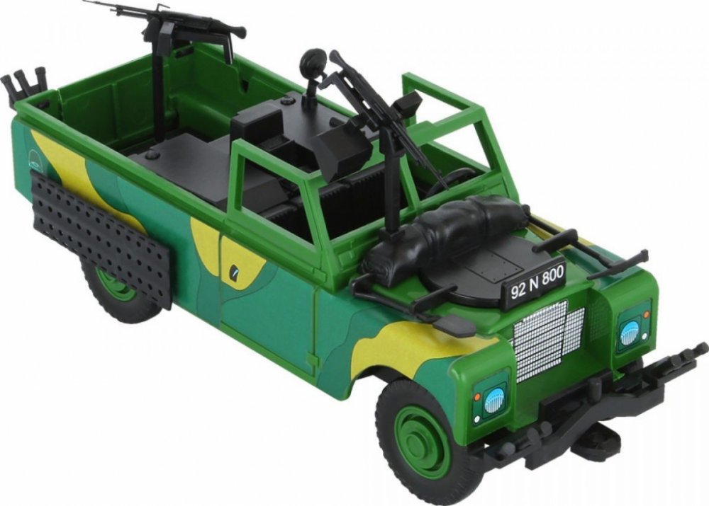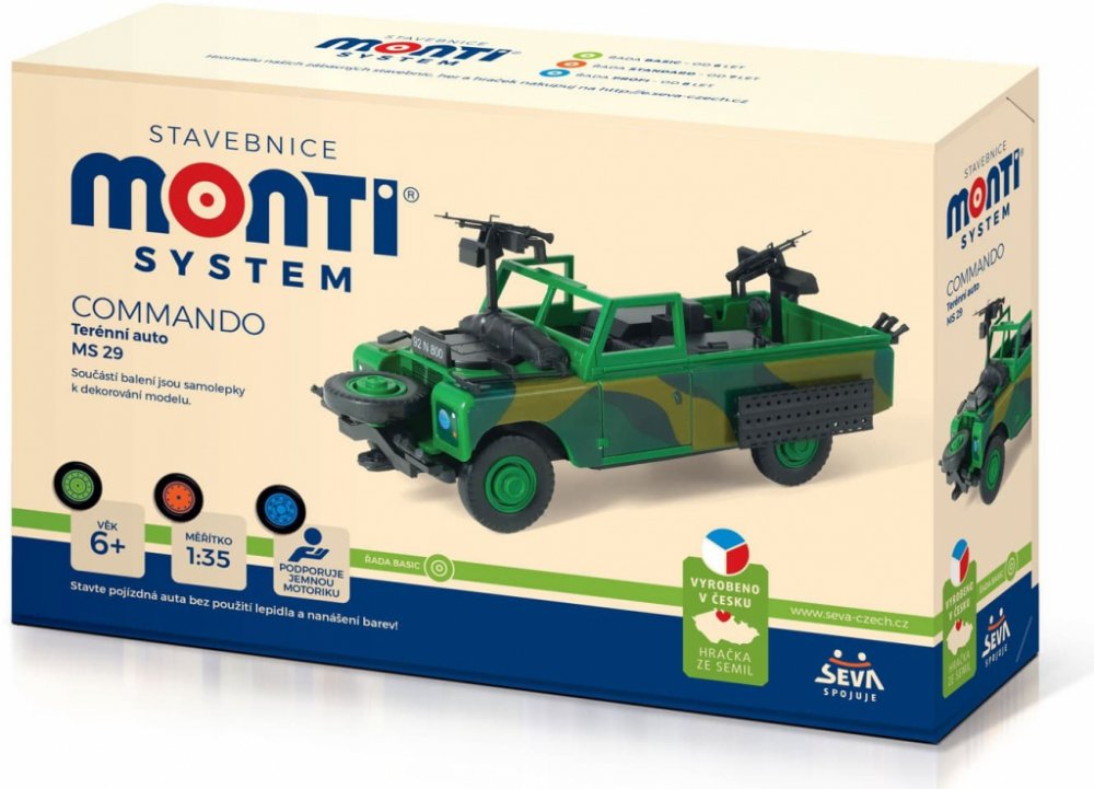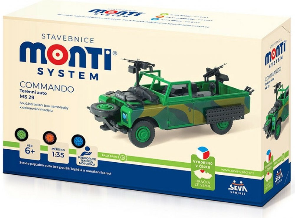 Model Monti System MS č.29 - Commando je ozbrojený terénní Land Rover. Land Rover Monti System MS 29 v měřítku 1:35 patří do řady modelů Monti System BASIC, tedy mezi jednodušší stavebnice s menším počtem dílů.