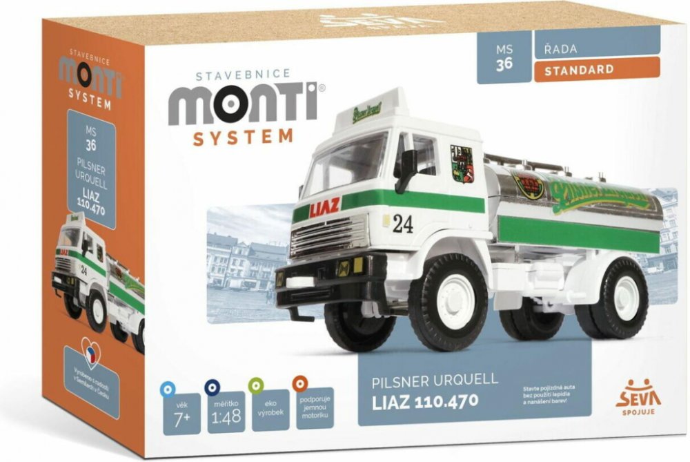 Model Monti System MS č.36 - Pilsner Urquell je cisternový vůz Liaz pro převoz piva Pilsner Urquell. Liaz Monti System MS 36 v měřítku 1:48 patří do řady modelů Monti System STANDARD, tedy mezi středně složité stavebnice.
