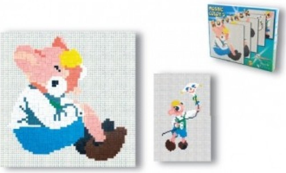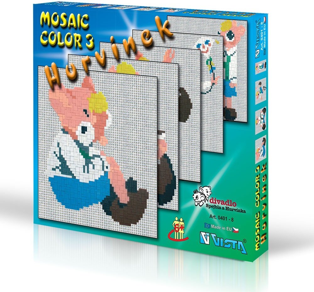 Výuková Mozaika Color 3 Hurvínek určená nejmladším dětem, a její obsah představuje 1912 ks v 11-ti barvách. (bílá, žlutá, světle růžová, růžová, růžovo-béžová, modrá, zelená, světle hnědá, tmavě hnědá, šedá a černá).