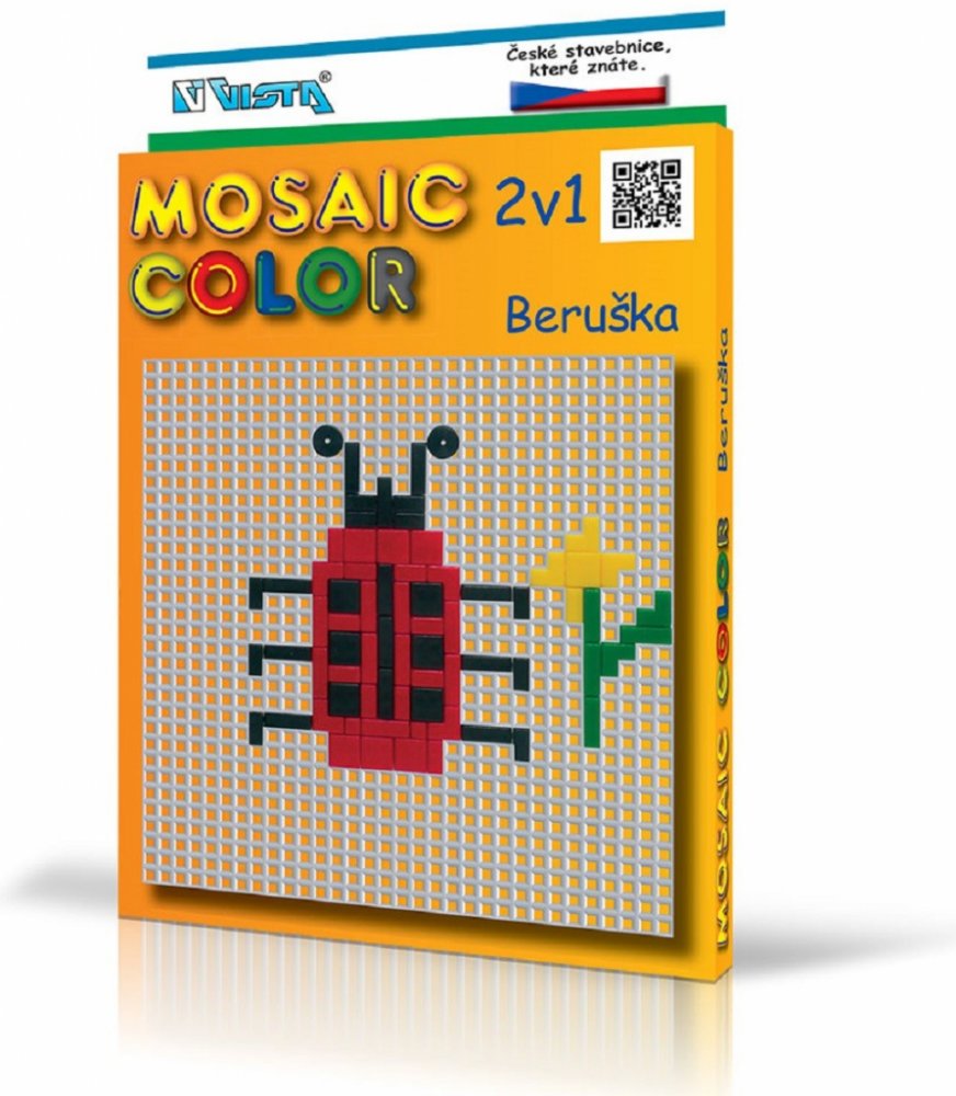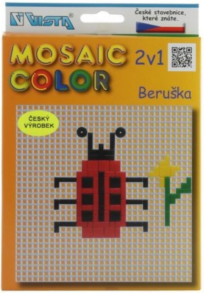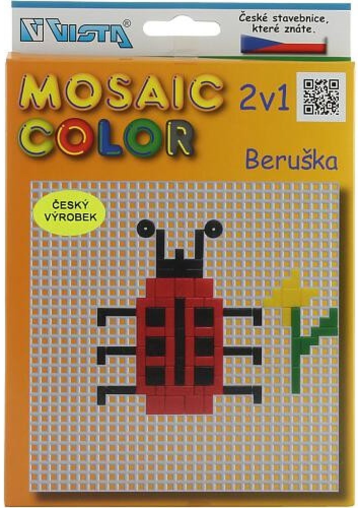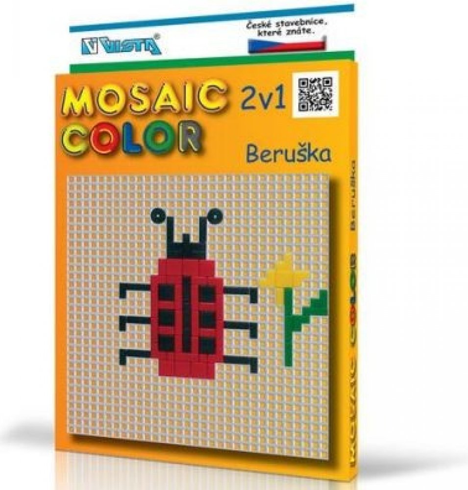 Stavebnice Mosaic Color 2v1 Beruška obsahuje 186 dílků ve 4 barvách - červená, černá, zelená, žlutá. Poskládejte si berušku, šneka na louce nebo cokoliv dle vaší fantazie. Stavebnice mozaikového typu Mosaic Color je nejen skvělá hračka, ale i pomůcka pro cvičení jemné motoriky vašich dětí. Kromě motoriky si děti budou zlepšovat představivost a tvořivost. Základem stavebnice Mosaic Color je plastová mřížka, do které se vmačkávají dílky dle fantazie nebo předlohy. Plastové mřížky jdou navíc spojovat, takže si můžete vytvořit neomezeně velké plátno pro vaši mozaiku! Dílky Mosaic Color jsou vyráběny v 6 základních barvách - žlutá, červená, modrá, zelená, bílá a černá. Všechny stavebnice Mosaic Color jsou vzájemně plně kompatibilní, takže ji můžete neustále rozšiřovat a doplňovat o nové dílky. Všechny hračky a stavebnice značky VISTA jsou vyrobeny v České republice! Jsou vyráběny poctivě a s ohledem na to, že si se stavebnicemi budou hrát naše/vaše děti. Rozměry: 17 x 24 x 1 cm Hmotnost: 0,1196 kg