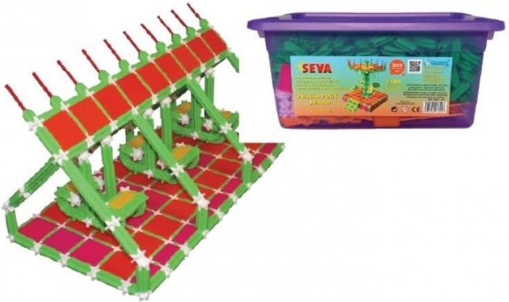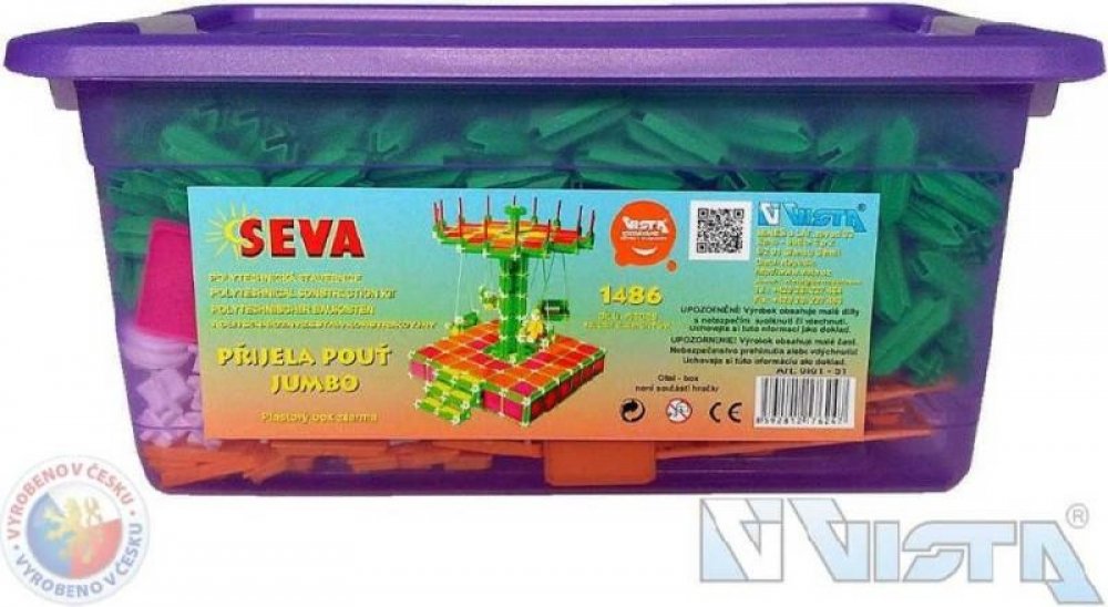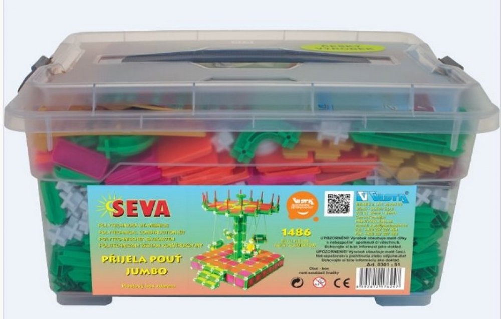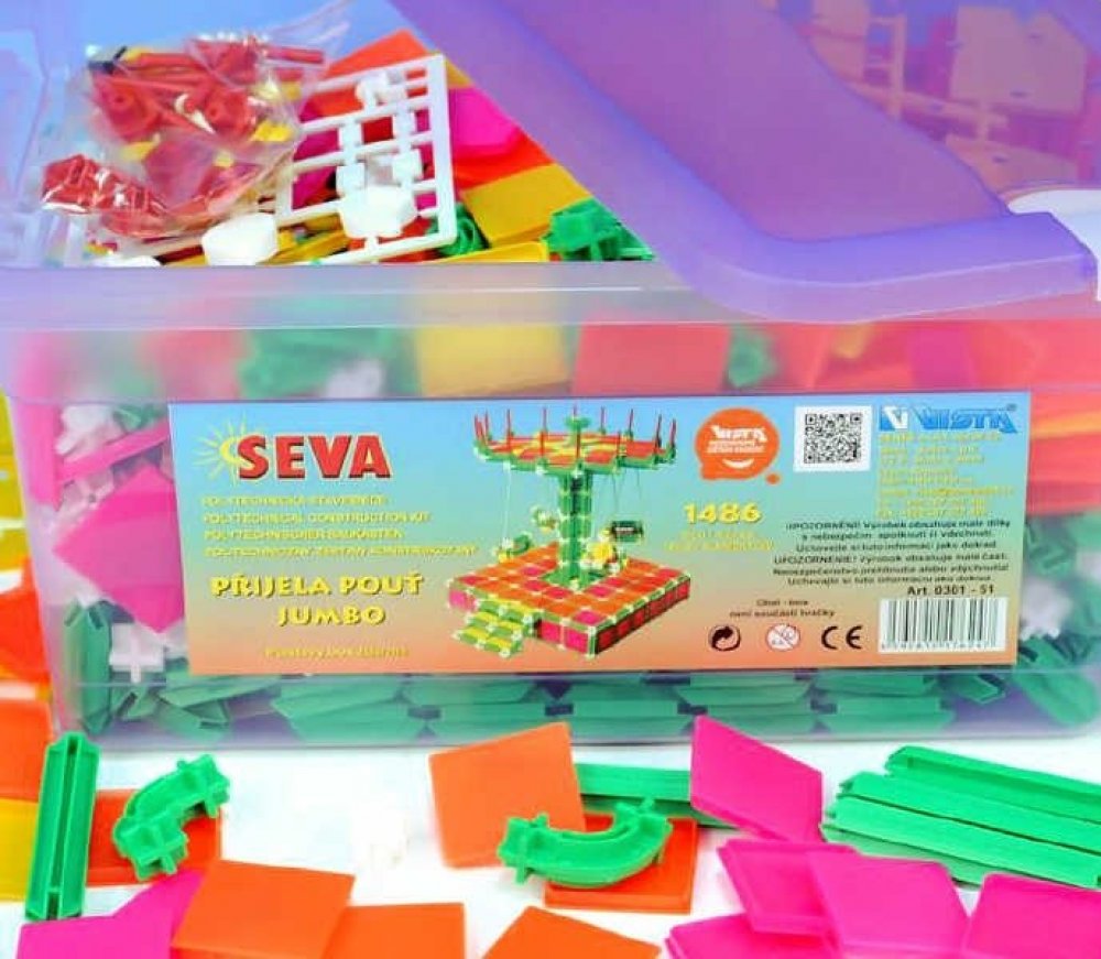 Země původu: ČR Stavebnice Seva Přijela Pouť Jumbo v praktickém boxu obsahuje 1486 dílků ve zcela nových, veselých barvách. Umožňuje sestavit např. řetízkový kolotoč a spoustu dalších atrakcí...u stavebnice SEVA se fantazii meze nekladou.