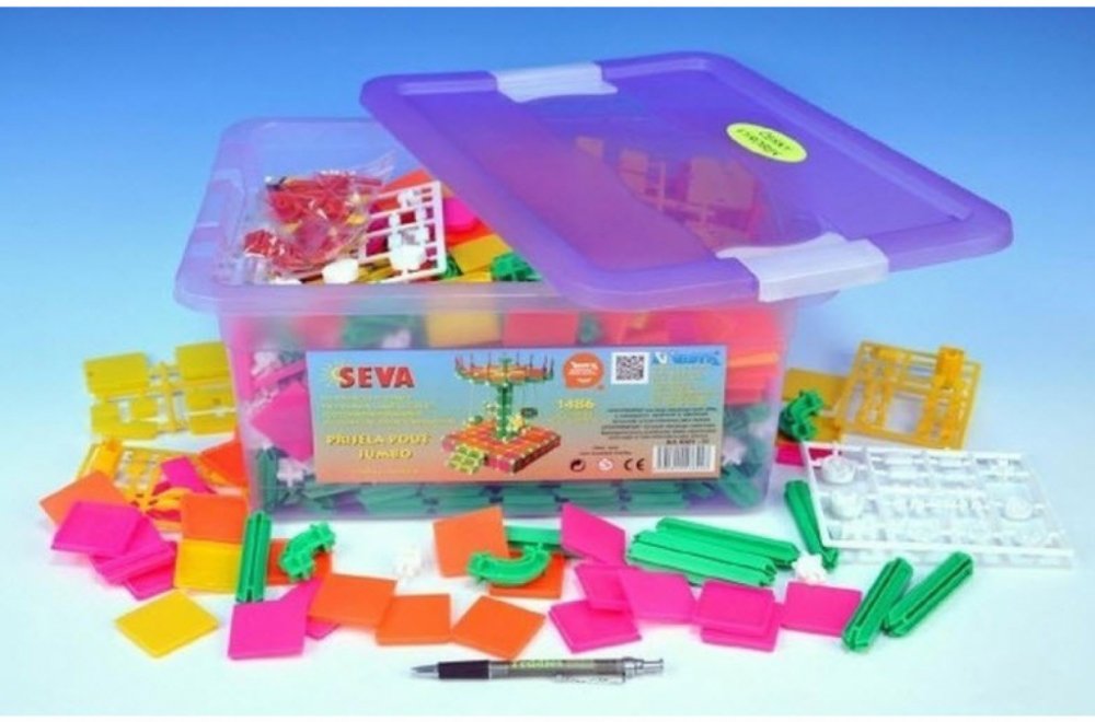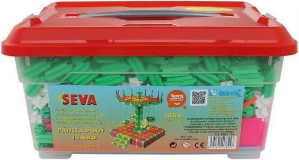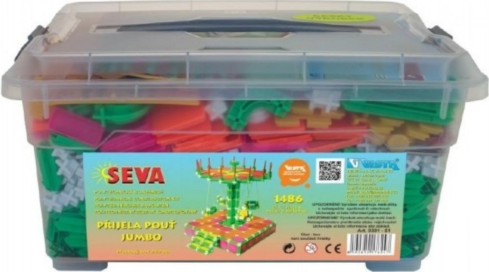 Stavebnice Seva Přijela Pouť Jumbo v praktickém boxu obsahuje 1486 dílků ve zcela nových, veselých barvách. Umožňuje sestavit např. řetízkový kolotoč a spoustu dalších atrakcí...u stavebnice SEVA se fantazii meze nekladou.