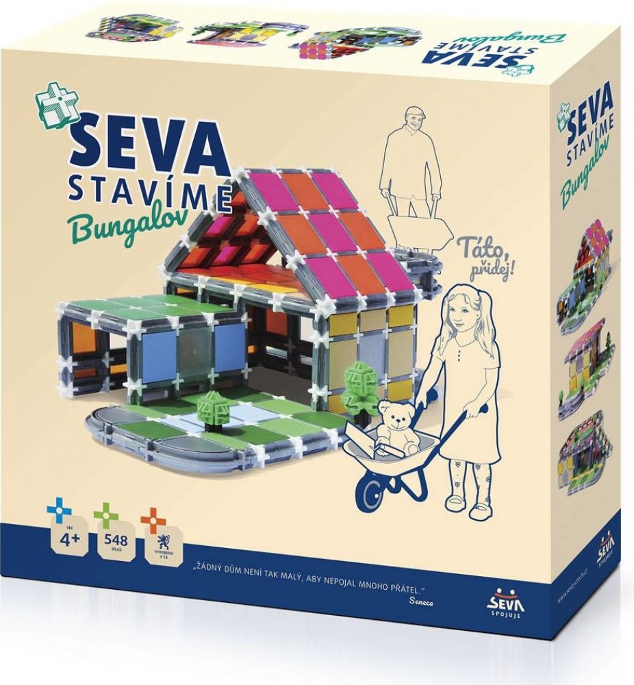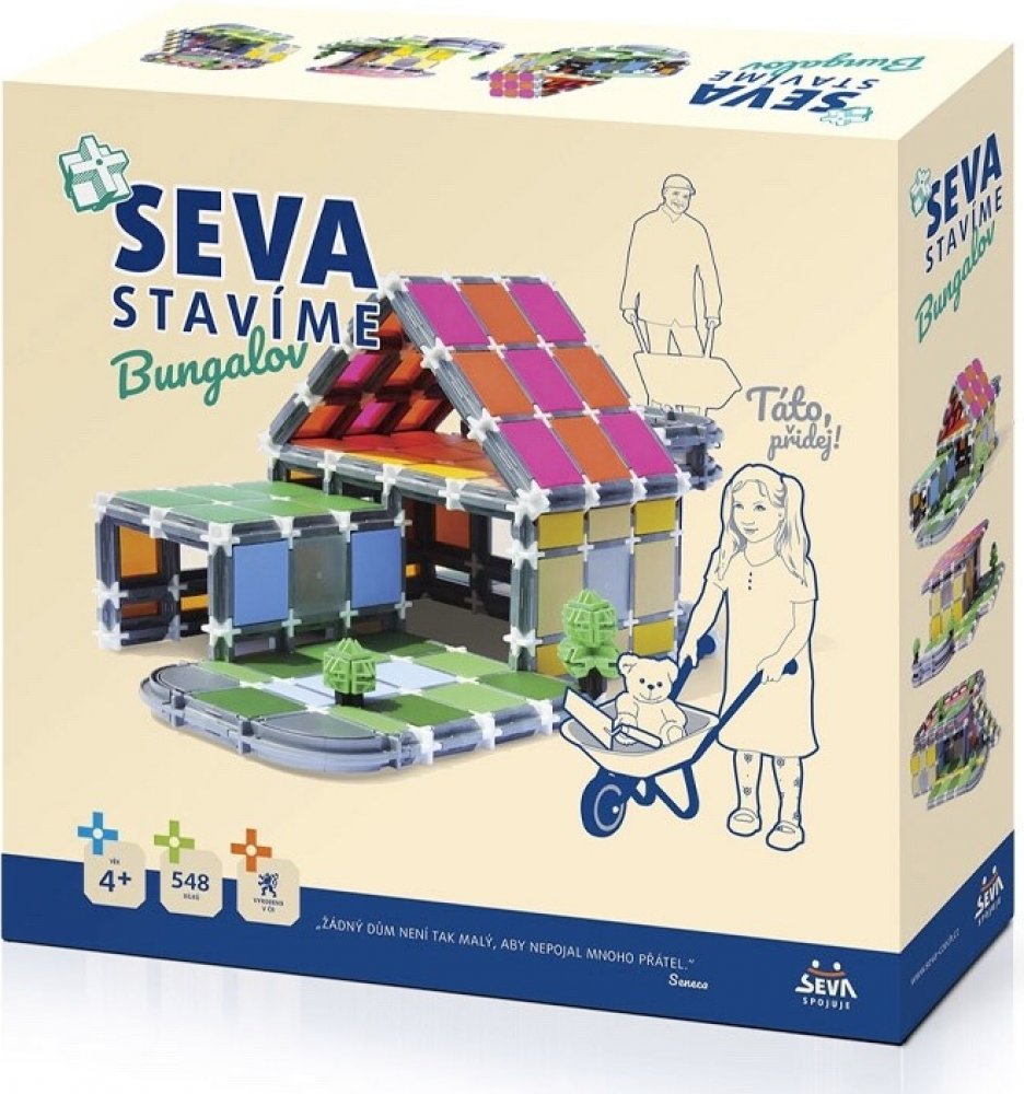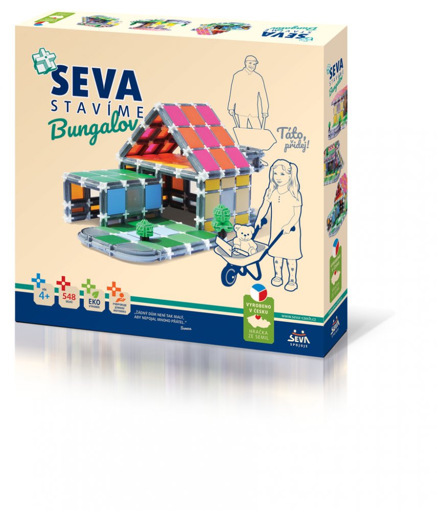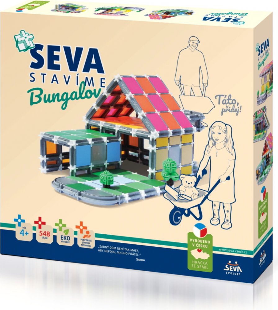 "Mami, tati! S bráchou jsme pro nás postavili nový dům!“ Se stavebnicí SEVA STAVÍME Bungalov postavíte mnoho variací na téma náš dům, náš hrad.... krásné je, že každý chceme bydlet jinak. Už tušíte, jak vy? Balení obsahuje 548 dílků.Rozměr krabice: 35 x 33 x 7 cmVhodné od 4 letTechnické údaje:Roky 04Obsah balení:Stavebnice Seva Stavíme Bungalov plast 548 dílků v krabici 35x33x7cmPokud není uvedeno jinak, cena se vztahuje na 1 ks produktu.Konkrétní barvu nebo druh výrobku není možné z technických důvodů zvolit, objednávce bude přidělena náhodná varianta dle skladových možností.