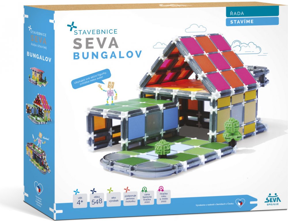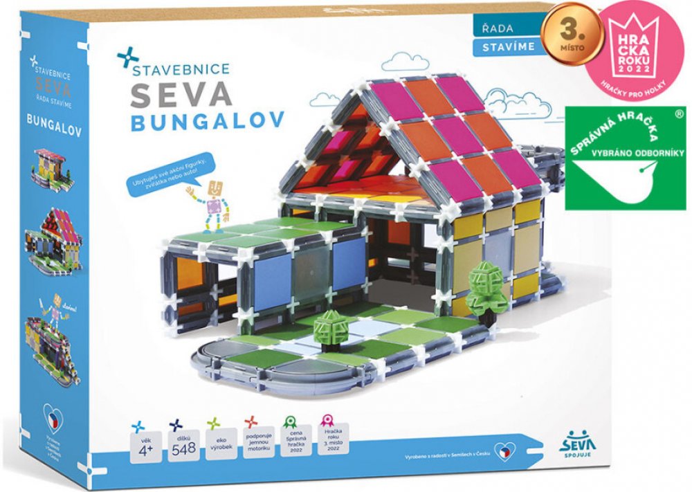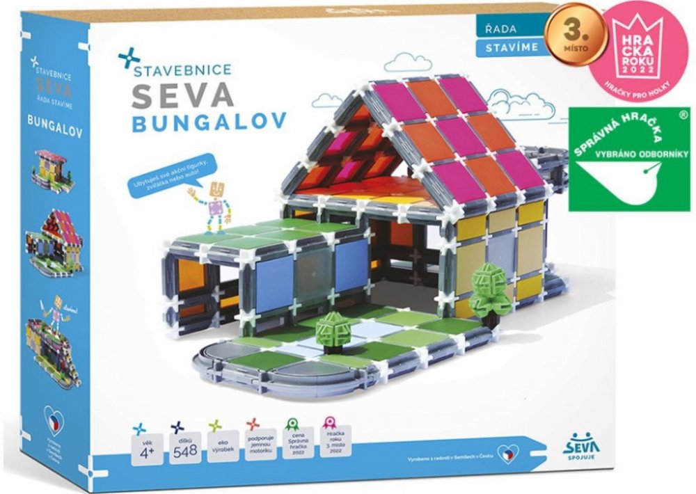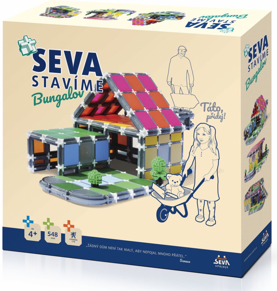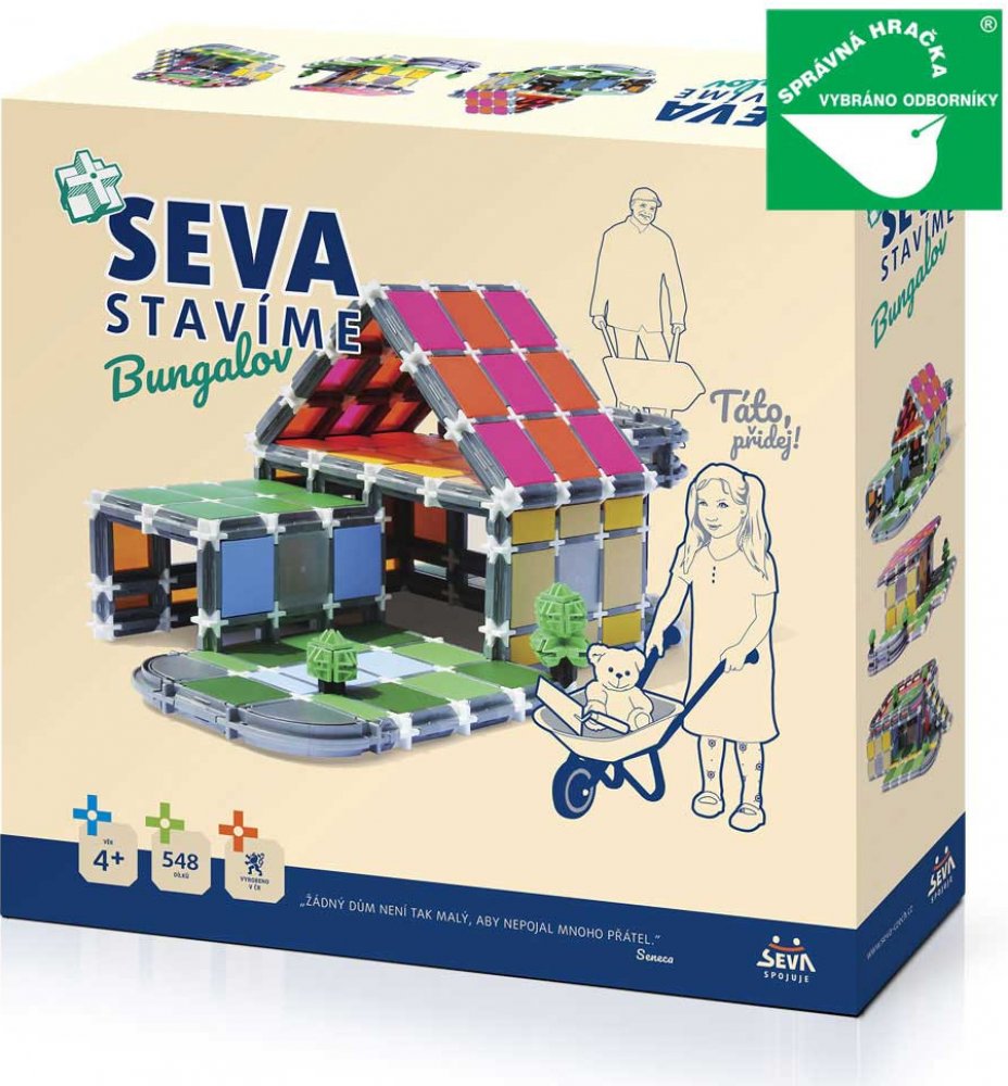 "Mami, tati! S bráchou jsme pro nás postavili nový dům!“ Se stavebnicí SEVA STAVÍME Bungalov postavíte mnoho variací na téma náš dům, náš hrad.... krásné je, že každý chceme bydlet jinak. Už tušíte, jak vy? Balení obsahuje 548 dílků.Rozměr krabice: 35 x 33 x 7 cmVhodné od 4 letTechnické údaje:Roky 04Obsah balení:Stavebnice Seva Stavíme Bungalov plast 548 dílků v krabici 35x33x7cmPokud není uvedeno jinak, cena se vztahuje na 1 ks produktu.Konkrétní barvu nebo druh výrobku není možné z technických důvodů zvolit, objednávce bude přidělena náhodná varianta dle skladových možností.
