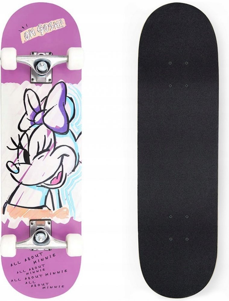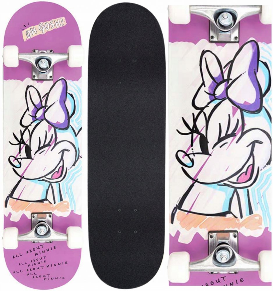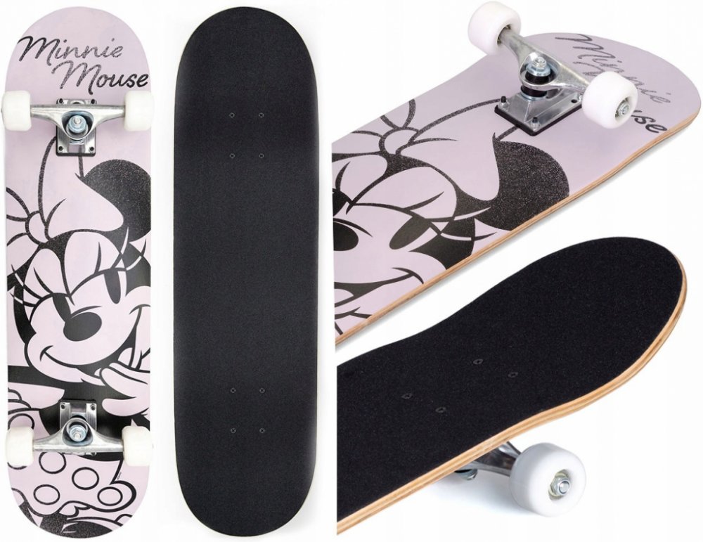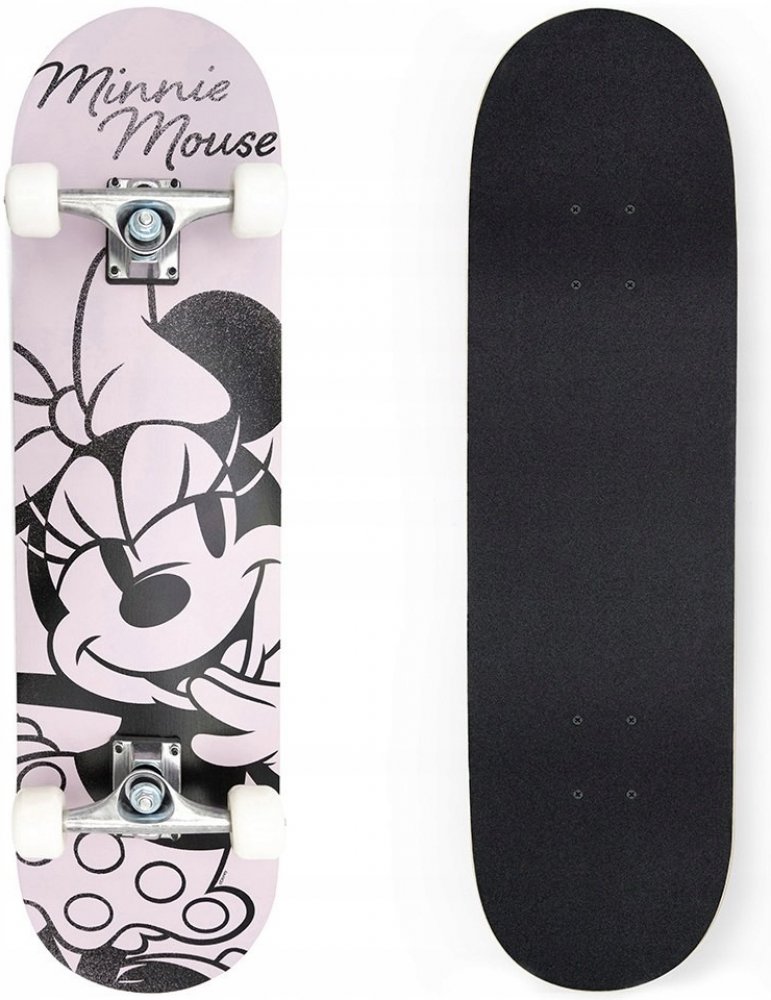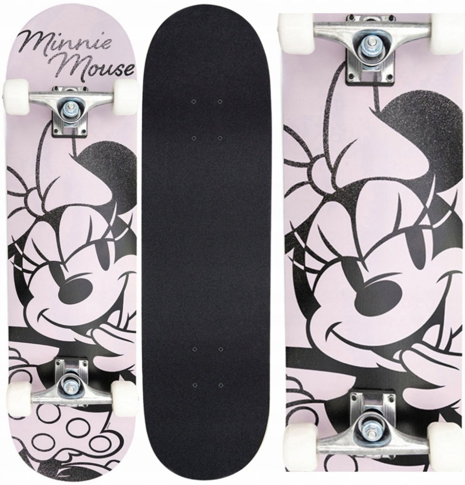 Skateboard Disney MINNIE MOUSE. Určen pro všechny začínající i pokročilé skateboardisty. Je ideální pro rekreační jízdu ve městě nebo ve skateparcích. Tento skateboard je vybaven kvalitními ložisky ABEC7 a kolečky o rozměrech 50 × 36 mm, které zaručují bezpečnou a pohodlnou jízdu. Deska je vyrobena z javorového dřeva. Horní strana desky je opatřena protiskluzovým gripem, který zabraňuje sklouznutí. Produkt byl navržen, vyroben a uveden na trh v souladu s požadavky EN 13613: 2009, třída B.
