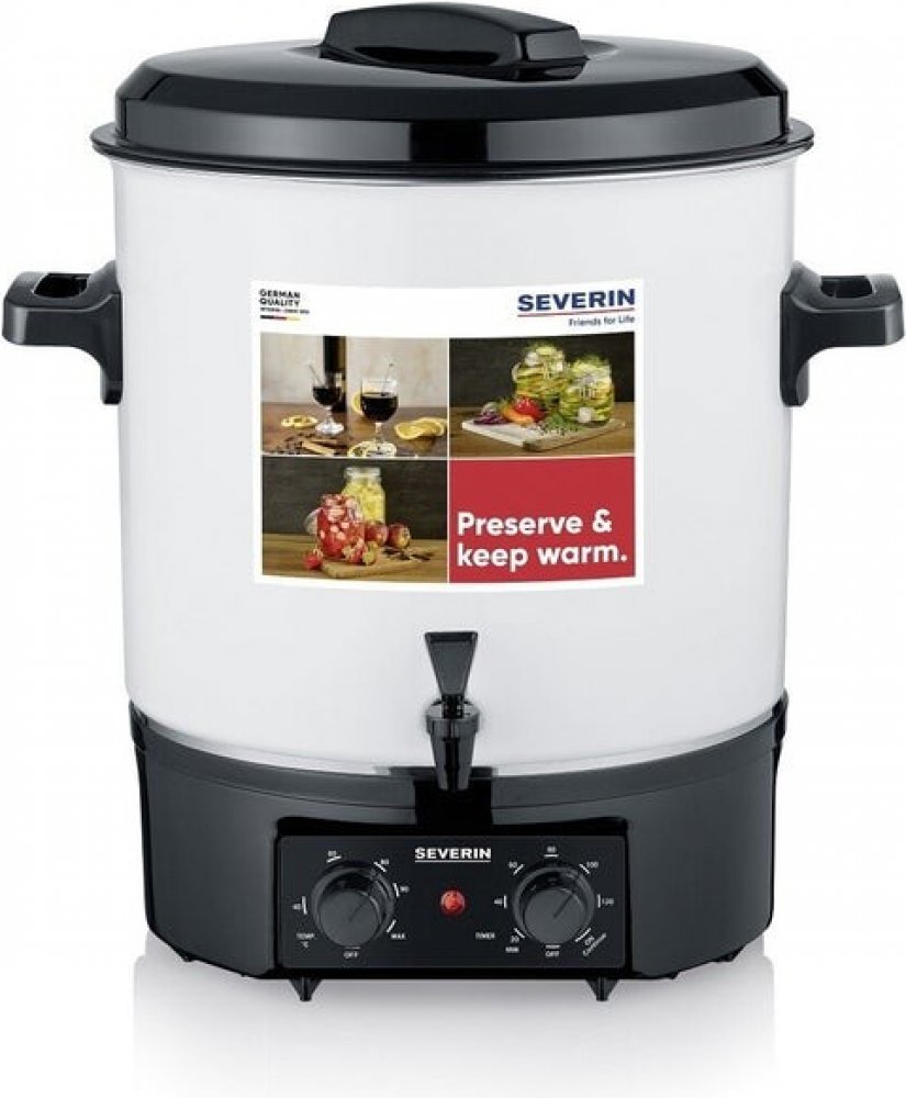 Pokud se chystáte zavařovat nebo se již tomuto způsobu zdravé konzervace potravin věnujete, pak vás jistě zaujme elektrický zavařovací hrnec Severin EA 3655. Zavaříte v něm kompoty, marmelády, džemy, houby, maso, ovocné a zeleninové směsi, paštiky i hotové pokrmy. Dokáže dokonce rozpustit med nebo sterilizovat mošt, poslouží i jako skvělá várnice třeba na polévky apod. Praktický zavařovací hrnec Severin EA 3655 s funkcí udržování teploty zachová teplotu horkých nápojů jako je například čaj, grog, káva nebo svařené víno. Díky vypouštěcímu kohoutku lze hrnec využít také jako nápojový automat. Klíčové vlastnosti zavařovacího hrnce SEVERIN EA 3655 Skvělý smaltovaný hrnec s všestranným využitím Vhodný pro zavařování, sterilizaci, jako várnice či nápojový automat SEVERIN EA 3655 s funkcí udržování teplotyPraktický vypouštěcí kohoutekObjem 27 litrů (pojme až 14 litrových sklenic)Termostat pro plynulé nastavení teploty v rozmezí 40 - 100 °CČasovač na 120...