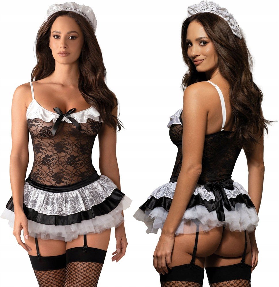 Housemaid kostýmy - OBSESSIVE. Svůdný kostým francouzské pokojské Housemaid Obsessive se skládá z pěti částí. Krajkový korzet s nastavitelnými řemínky k punčochám perfektně padne. Bílé saténové volánky a černá mašlička svůdně zdobí dekolt. Mini sukýnka odhalující zadeček má několik vrstev síťoviny, saténu a krajky. V pase se zavazuje saténovou stuhou. Sada dále obsahuje punčochy, černá krajková ta...