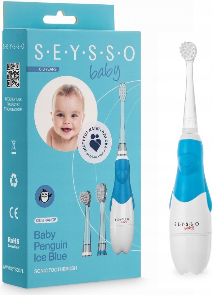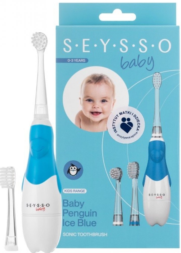 Sonický kartáček SEYSSO Baby Penguin Blue má malou, zaoblenou hlavici, jejíž jemná vlákna jemně čistí zuby. Je vybavena 2minutovým časovačem Baby Timerem, který vám pomůže dodržovat doporučenou dobu čištění zubů. Čtyři 30sekundové intervaly usnadní rovnoměrné umytí všech čtyř částí zubů – pravé a levé poloviny horního oblouku a pravé a levé poloviny dolního. Osvětlená špička usnadní rodičům čištění zubů dítěte a lehká a ergonomická rukojeť pomůže od útlého věku rozvíjet správné návyky spojené s ústní hygienou. Modrá barva kartáčku se bude líbit jak dívkám, tak chlapcům.