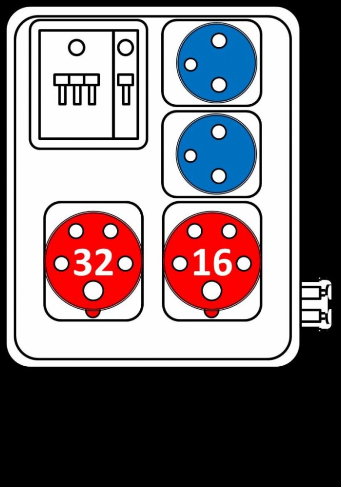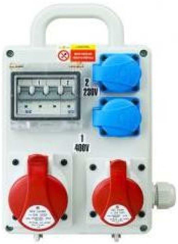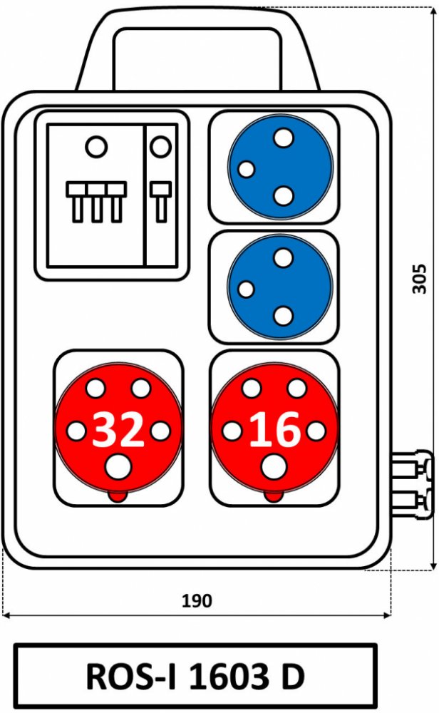 Zásuvková rozvodnice ROS-I 1601 se 2 zásuvkami 1653 (5-pól) 16 A 400 V a 2 zásuvkami pro 230V, jištěná jističi C16/3 a 1 x C16/1, IP 44 pro připojení třífázových i jednofázových elektrických spotřebičů.