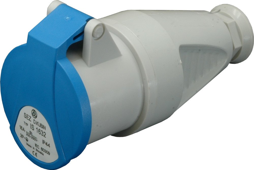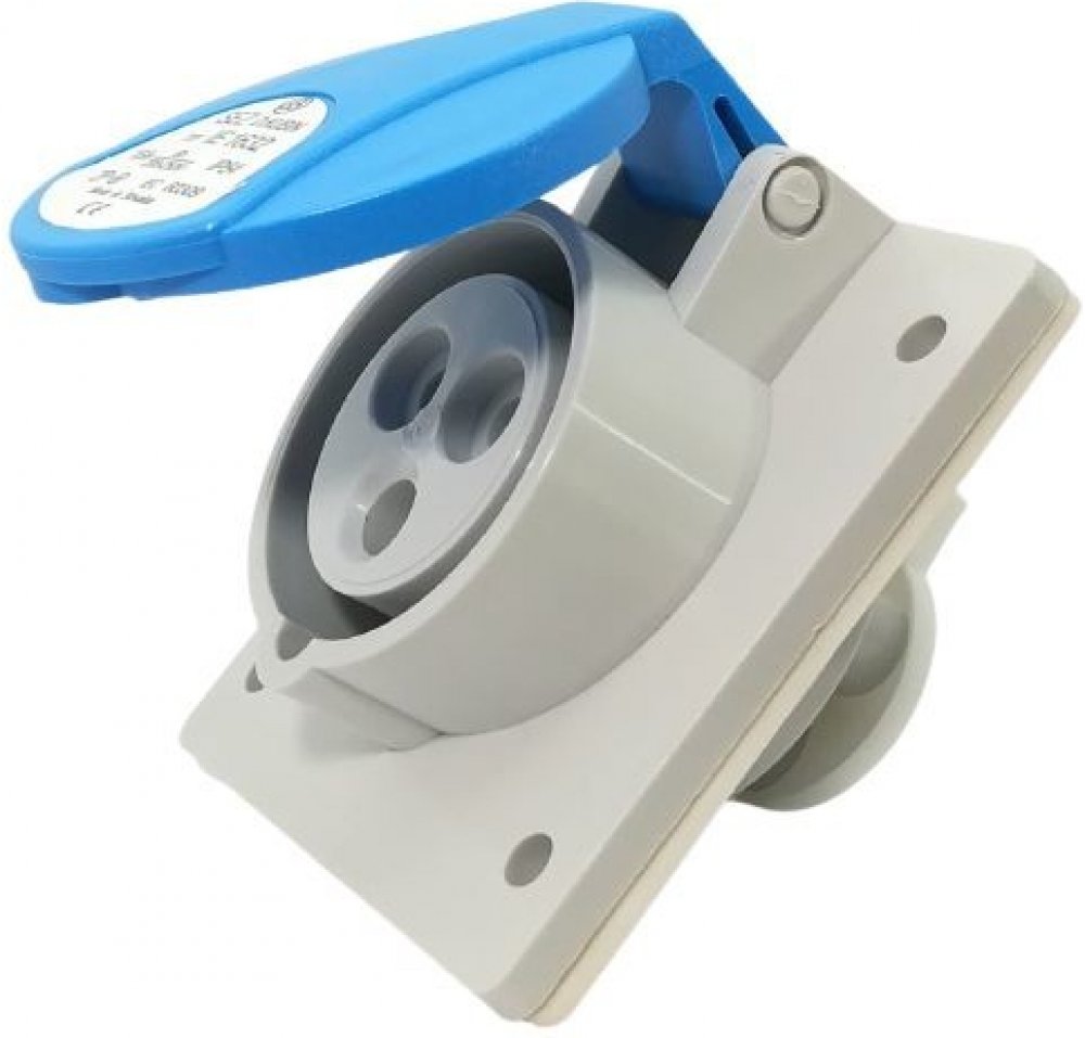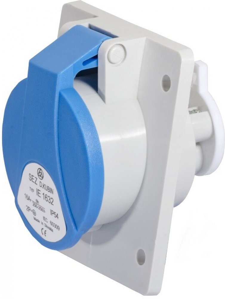 Průmyslová zásuvka vestavná SEZ IE 1632 je 3-pólová šikmá zásuvka pro jmenovité napětí 230V s proudem 16 A a venkovním krytím IP 54.