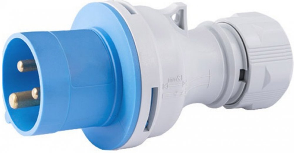 Průmyslová spojovací vidlice SEZ IVN 1632 je 3-pólová rovná spojovací vidlice pro jmenovité napětí 230 V s proudem 16 A a venkovním krytím IP 54.