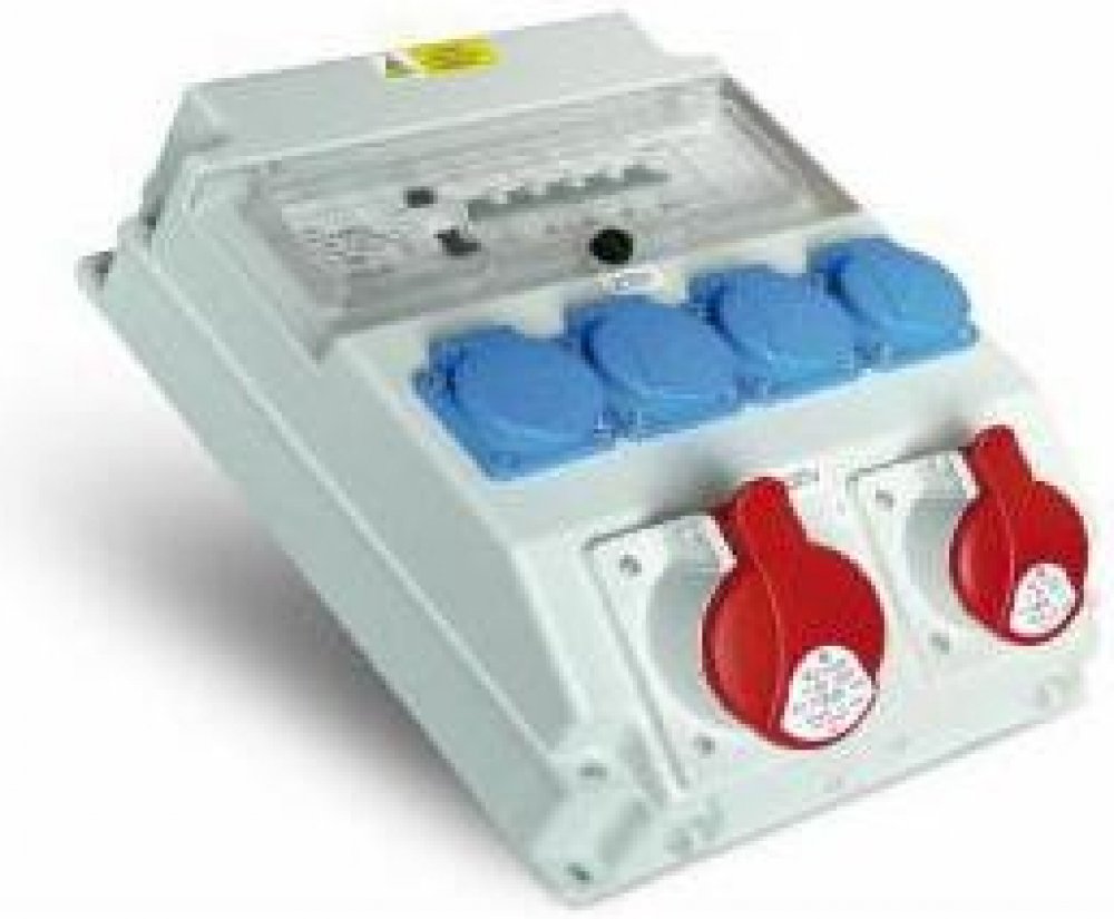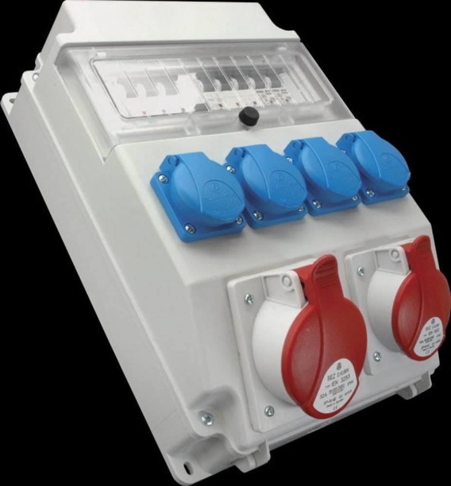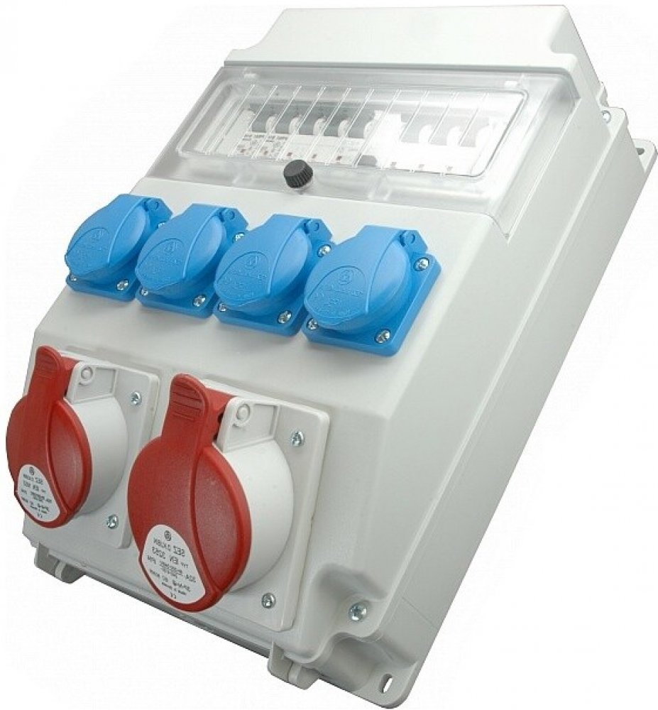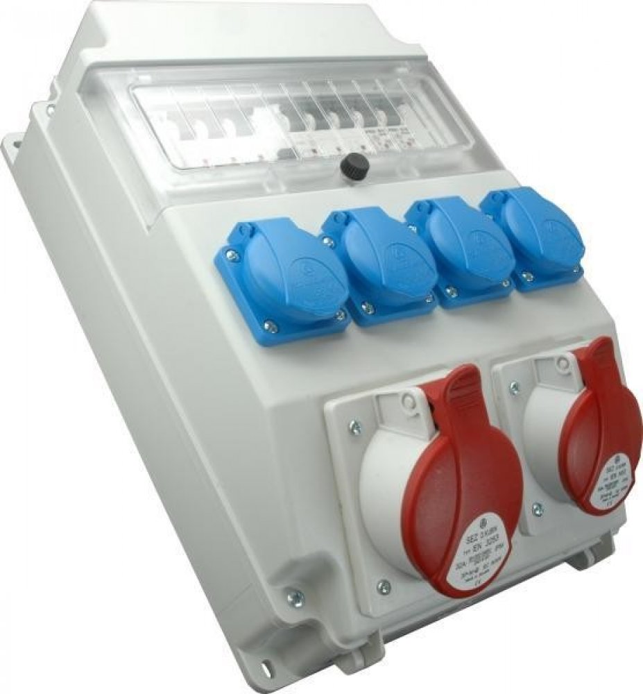 Rozvodnice obsahuje 4 venkovní zásuvky na 230 V a dále pak 5-pólové zásuvky na 380 V v provedení 16 A a 32 A.