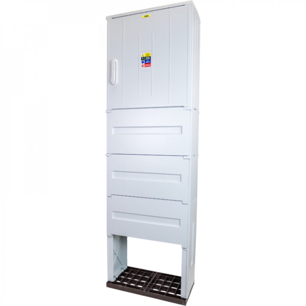 Elektroměrový rozvaděč pro 2 elektroměry se zemním dílem SFOS 2E1RP/F+ZD třífázový jednotarifný určený k zakopání do země jako samostatně stojící a s kabelovým prostorem navíc. Hodí se pro domy či objekty s vyšším odběrem elektřiny. Neumožňuje zapojení dvoutarifního měření a odběr v nízké sazbě (tzv. noční proud).