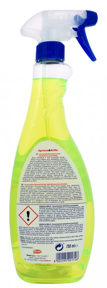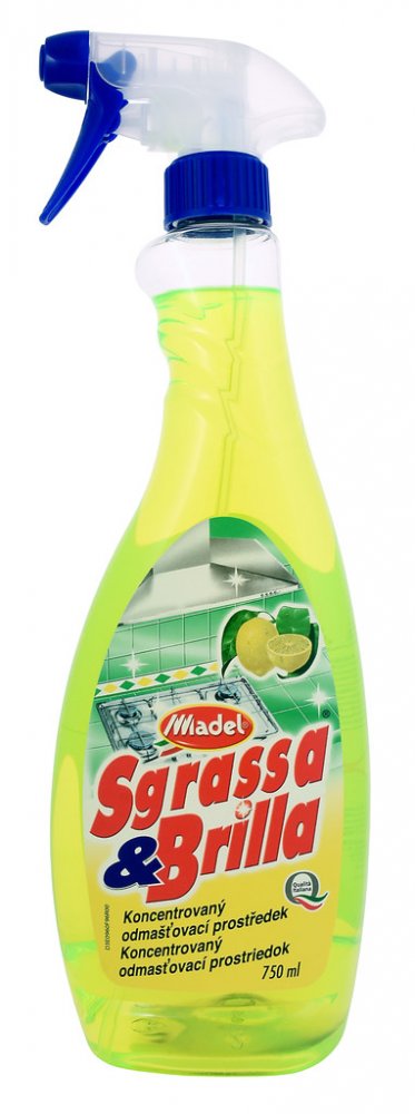 Přípravek Sgrassa e Brilla zaručeně odmastí veškeré povrchy a zanechá je lesknoucí se čistotou. Účinně odstraní veškerou mastnotu, a to i z motorů či převodovek. V praktickém balení ve spreji. Oplachuje se. Univerzální odmašťovací a čisticí prostředek. Odmašťuje a čistí kuchyňské trouby, dřezy, hrnce, kráječe, grily, obkládačky, pracovní plochy a podlahy. Doporučen i pro profesionální užití – např...