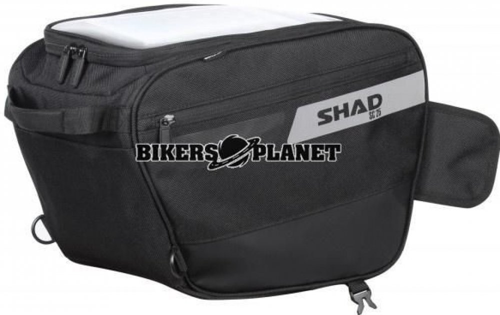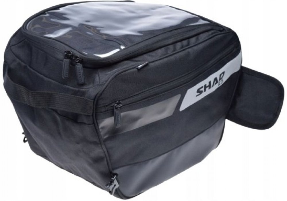Taška pro skútr SC25 do prostoru mezi nohy je vybavena 2 postranními kapsami a vejde se do ní přilba. V horní části naleznete průhlednou dotykovou kapsu, do které můžete vložit mapy, tablet nebo GPS.
