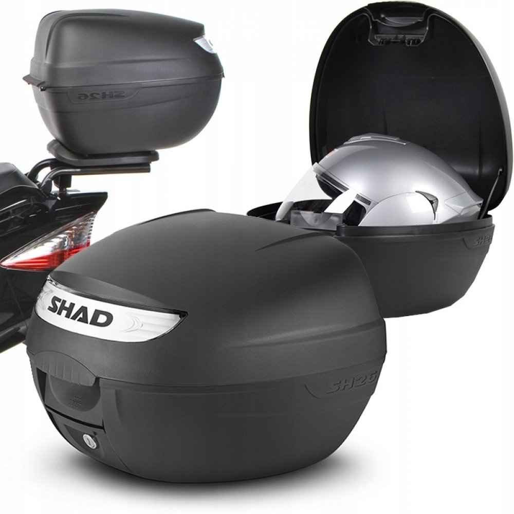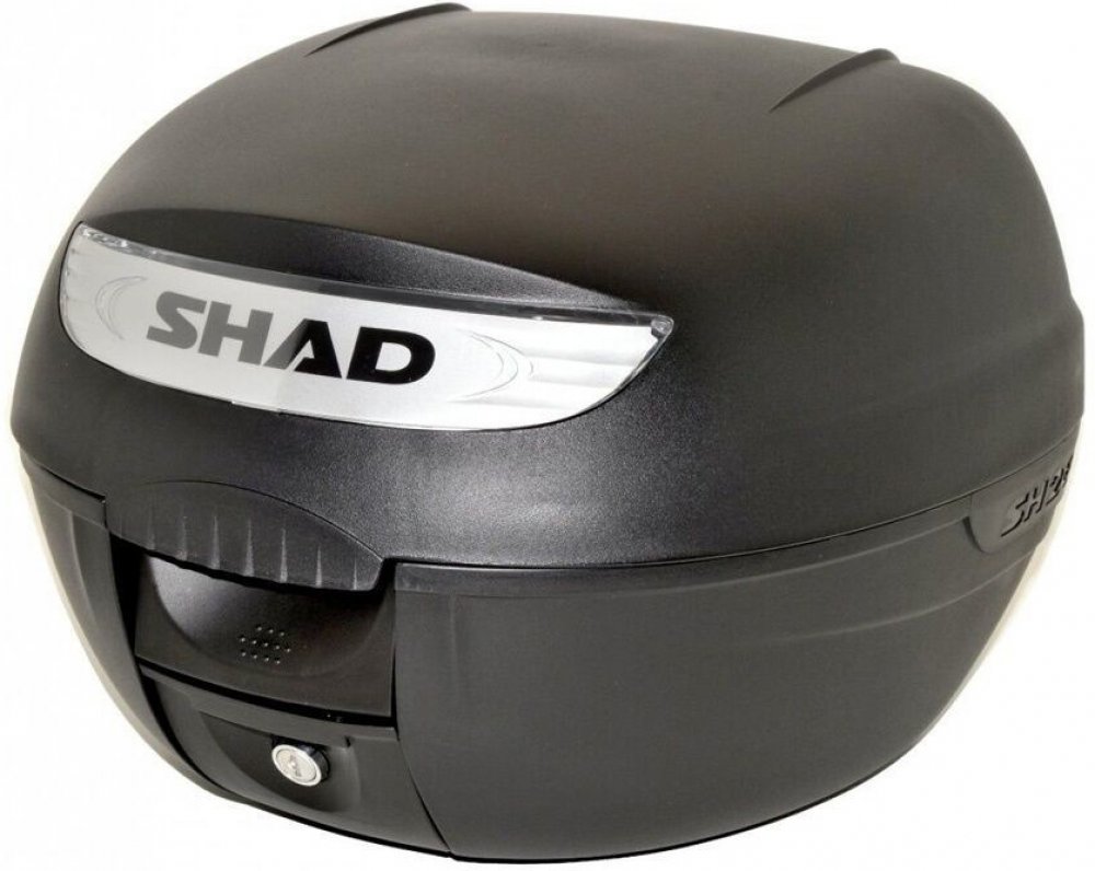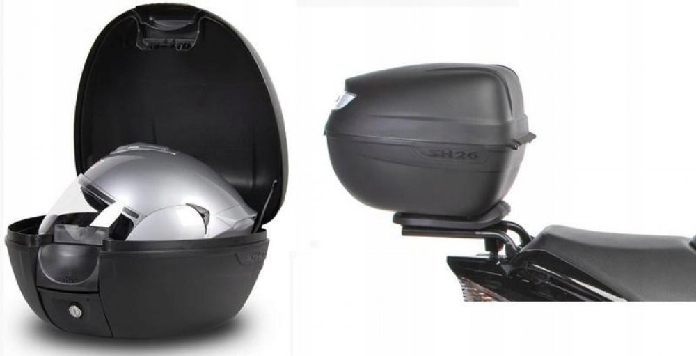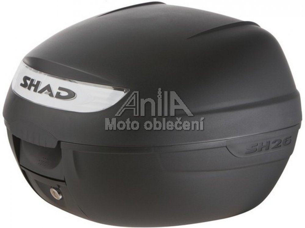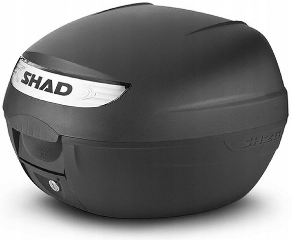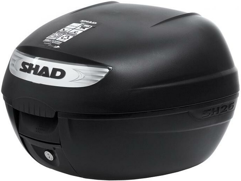 Vrchní kufr SH26 vhodný pro uložení jedné helmySH26 je nejmenší z řady vrchních kufrů SHAD, jeho kapacita je 26 litrů. Jedná se o kompaktní a velmi praktický vrchní kufr vyrobený z vysoce kvalitního tvrzeného polypropylenu, schopný pojmout otevřenou helmu nebo malou integrální helmu.Kufr je vybaven zámkem a stejně jako všechny vrchní kufry SHAD, je možné ho otevřít a zavřít pouze jednou rukou, k otevření nebo zavření není potřeba klíč. Klíč je nutný pouze v případě, že chceme kufr zamknout. Kufr má úchytku, která přebírá roli ergonomické rukojeti pro snadné přenášení kufru.Jako volitelné příslušenství lze ke kufru dokoupit brzdové světlo (D0B29KL). Jedná se o úsporné LED světlo, jehož montáž je velice snadná. Toto světlo zvyšuje bezpezpečnost provozu, protože motocykl se s tímto světlem stává mnohem viditelnější zezadu.Stejně jako všechny vrchní kufry SHAD (kromě TR48/TR37) je i SH26 dodáván s plotnou a sadou montážních šroubů.