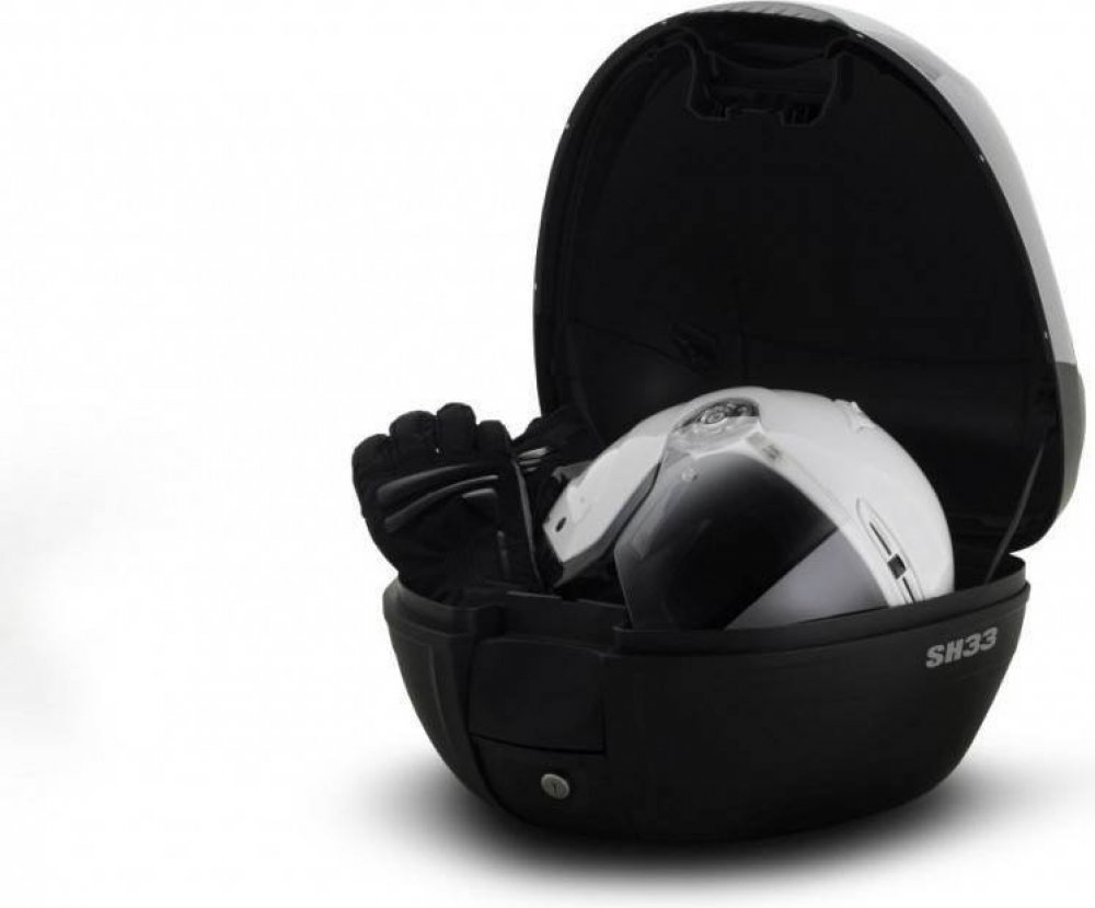SH33 je kompaktní kufr s kapacitou pro jednu helmu a rukavice. Opěrka, brzdové světlo a barevné kryty dostupné jako příslušenství. Včetně plotny.