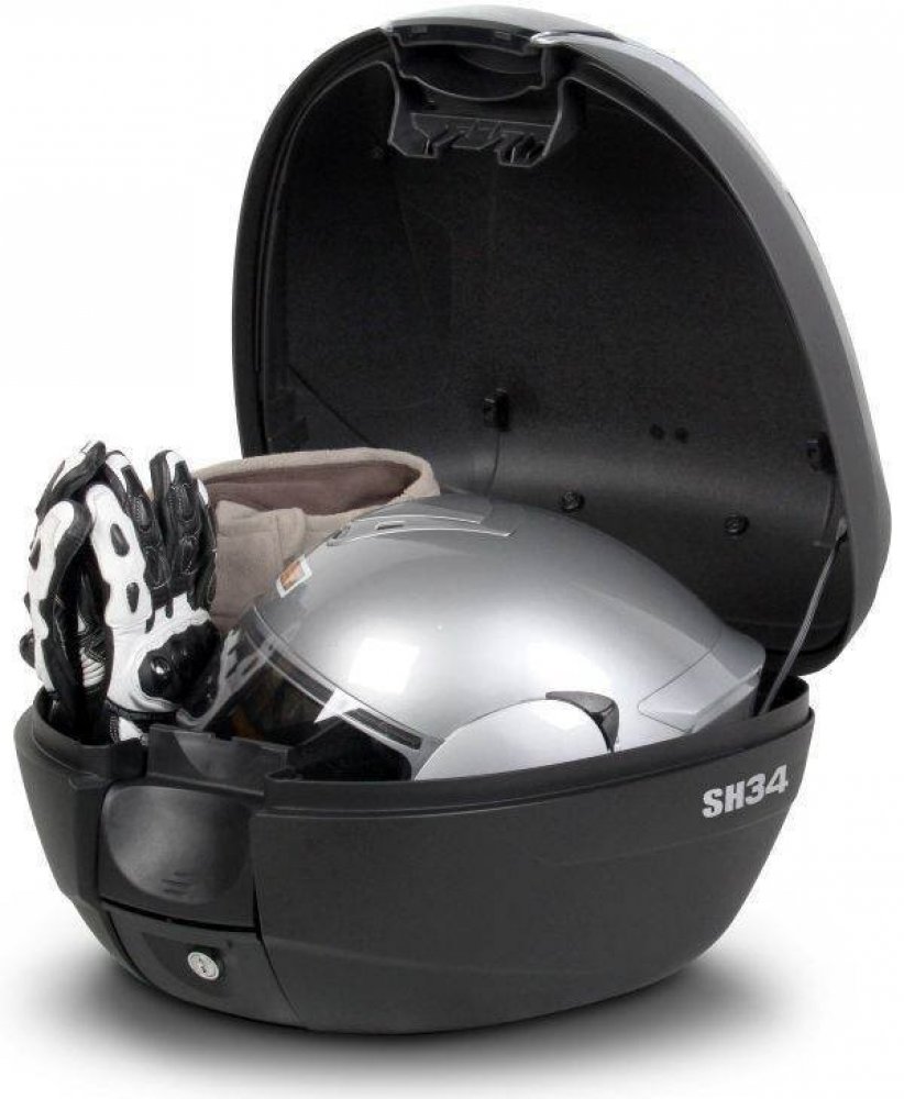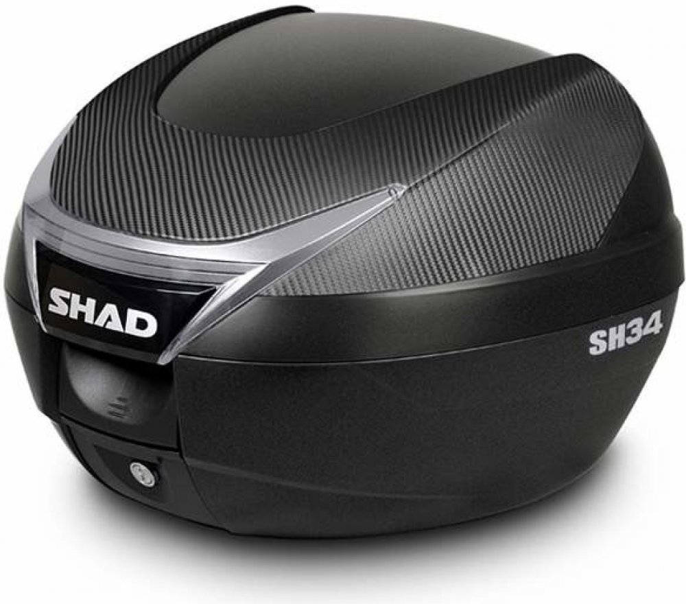 Vrchní kufr SH34 je kompaktní a velmi praktický vrchní kufr vyrobený z vysoce kvalitního tvrzeného polypropylenu, schopný pojmout vyklápěcí helmu a rukavice. Součástí standardní výbavy je kryt s karbonovým vzhledem, který kufru dodává agresivní a atraktivní vzhled. Tento vrchní kufr je určen pro ty, kteří hledají nejvyšší úroveň sofistikovanosti a stylu: je sportovní, elegantní a praktický zároveň. Vnitřní prostor byl optimalizován a dovoluje využít celý vnitřní objem, což je v tomto případě 34 litrů. Kufr je vybaven zámkem a stejně jako všechny vrchní kufry SHAD, je možné ho otevřít a zavřít pouze jednou rukou, k otevření nebo zavření není potřeba klíč. Klíč je nutný pouze v případě, že chceme kufr zamknout. Kufr má úchytku, která přebírá roli ergonomické rukojeti pro snadné přenášení kufru. Jako volitelné příslušenství lze ke kufru dokoupit opěrku a brzdové světlo. Opěrka (D0RI40) zaručuje větší pohodlí pro spolujezdce. Brzdové světlo (D0B29KL) je úsporné LED světlo, jehož montáž je velice snadná. Toto světlo zvyšuje bezpezpečnost provozu, protože motorka se s tímto světlem stává mnohem viditelnější zezadu.